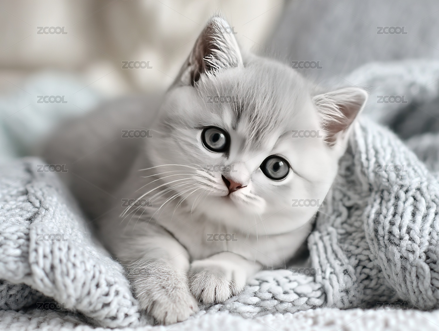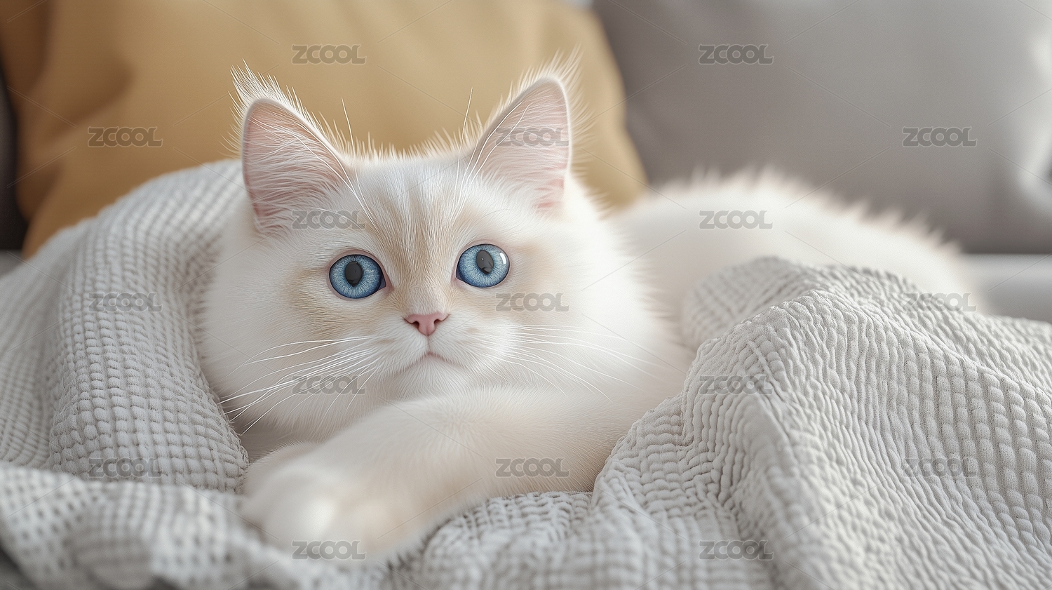 一只蓝白小猫咪悠闲地趴在沙发上休息