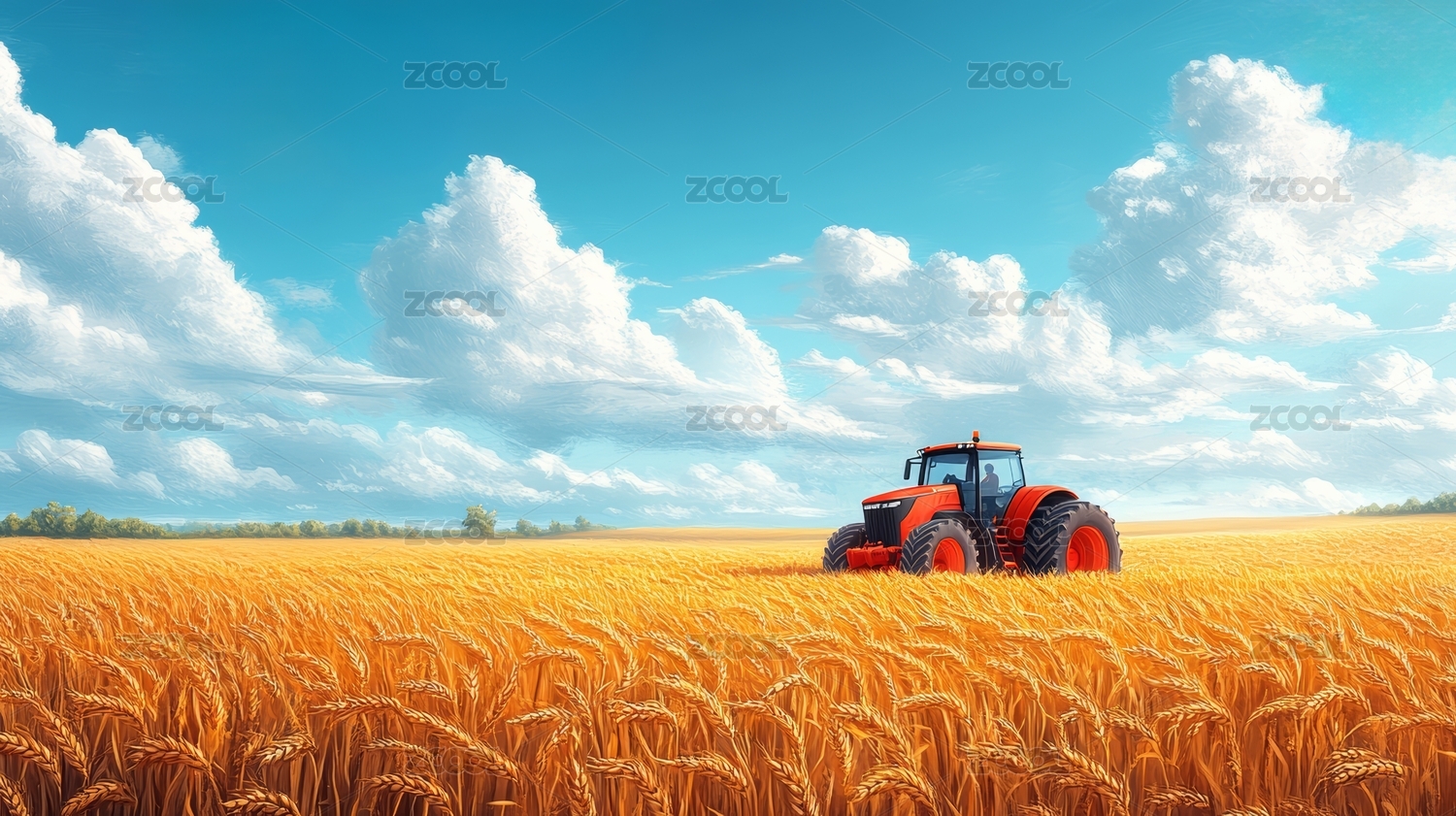 金黄麦田里的红色拖拉机