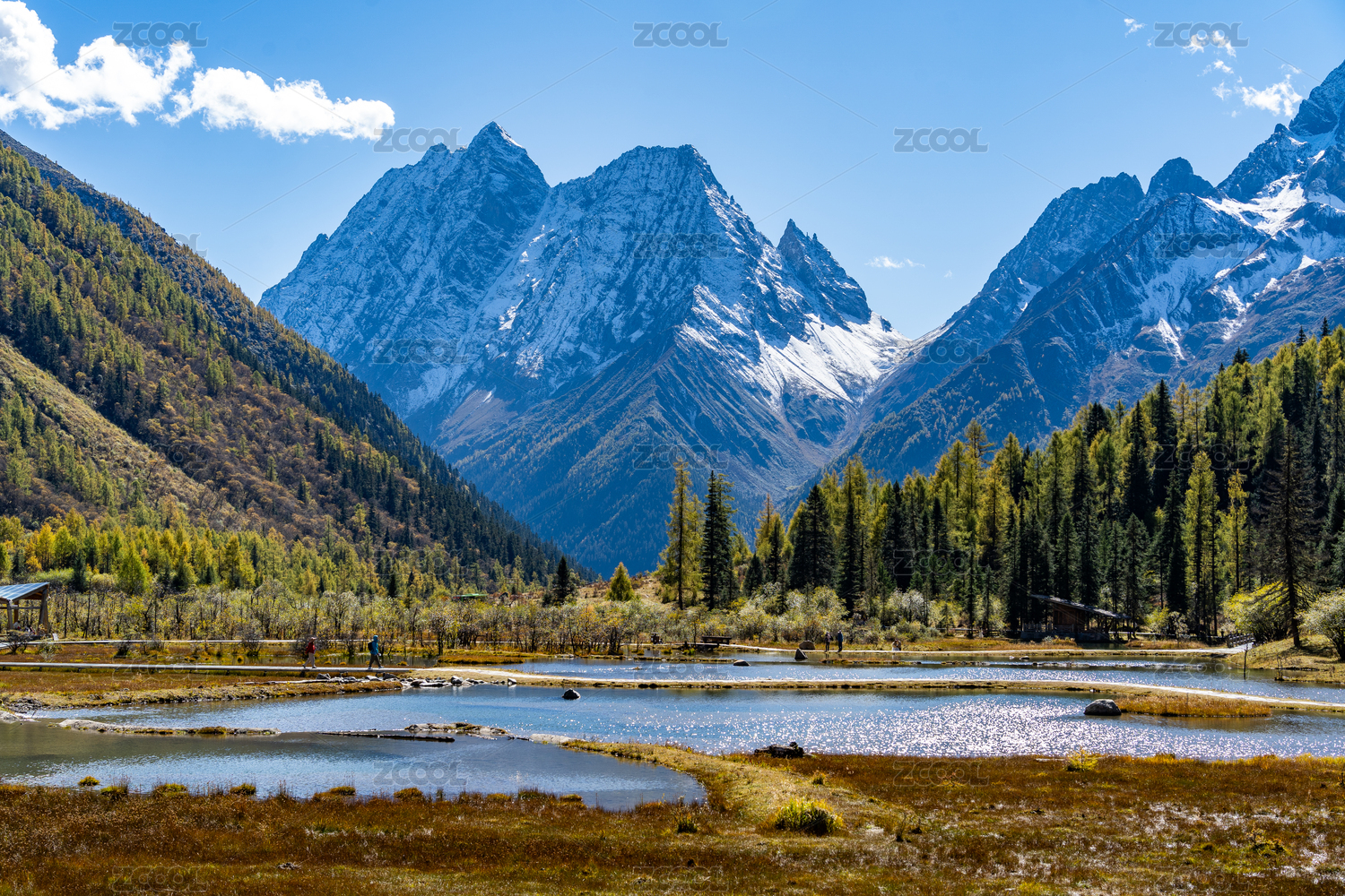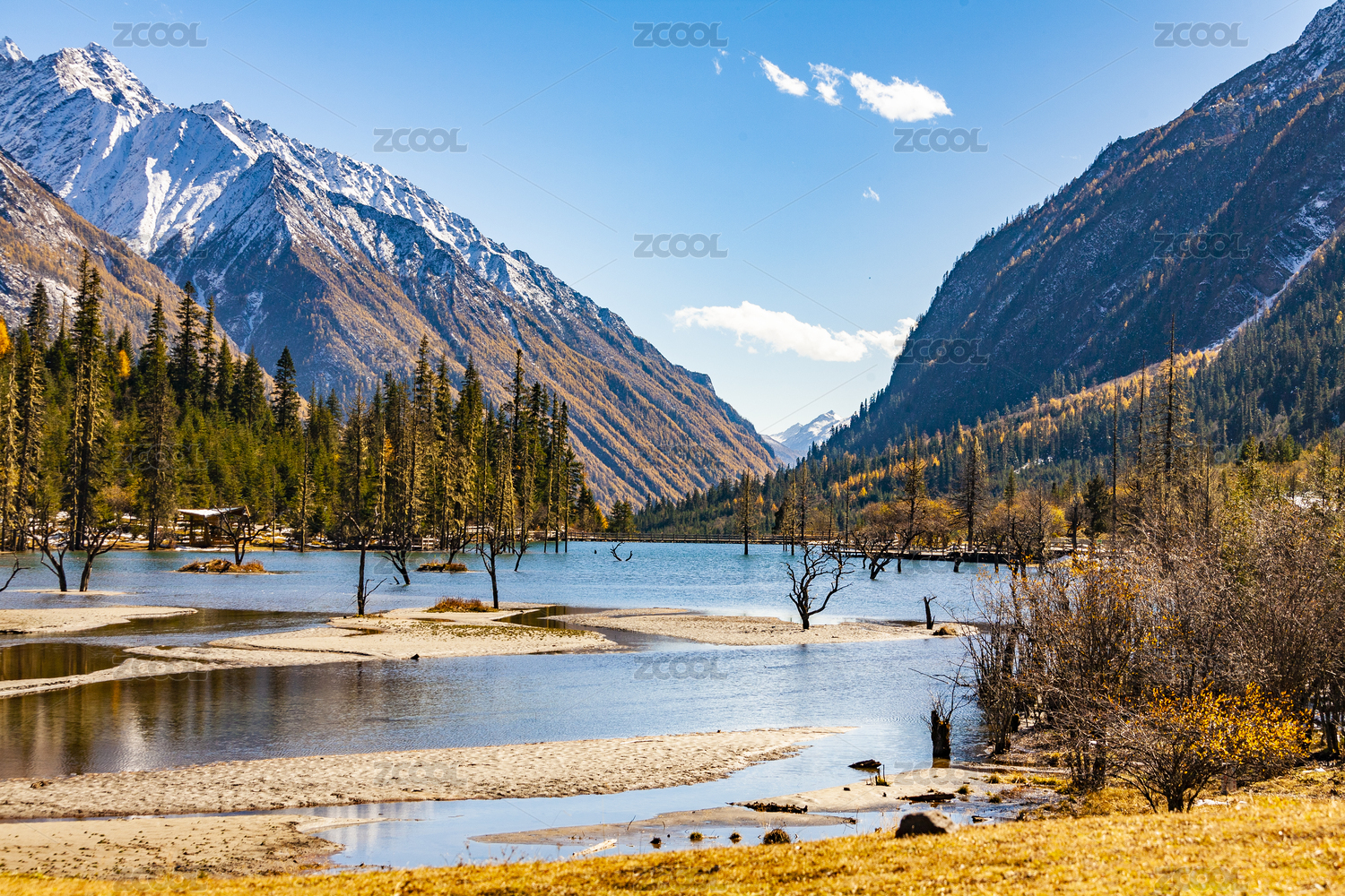 四姑娘山双桥沟秋季雪山彩林碧水景观