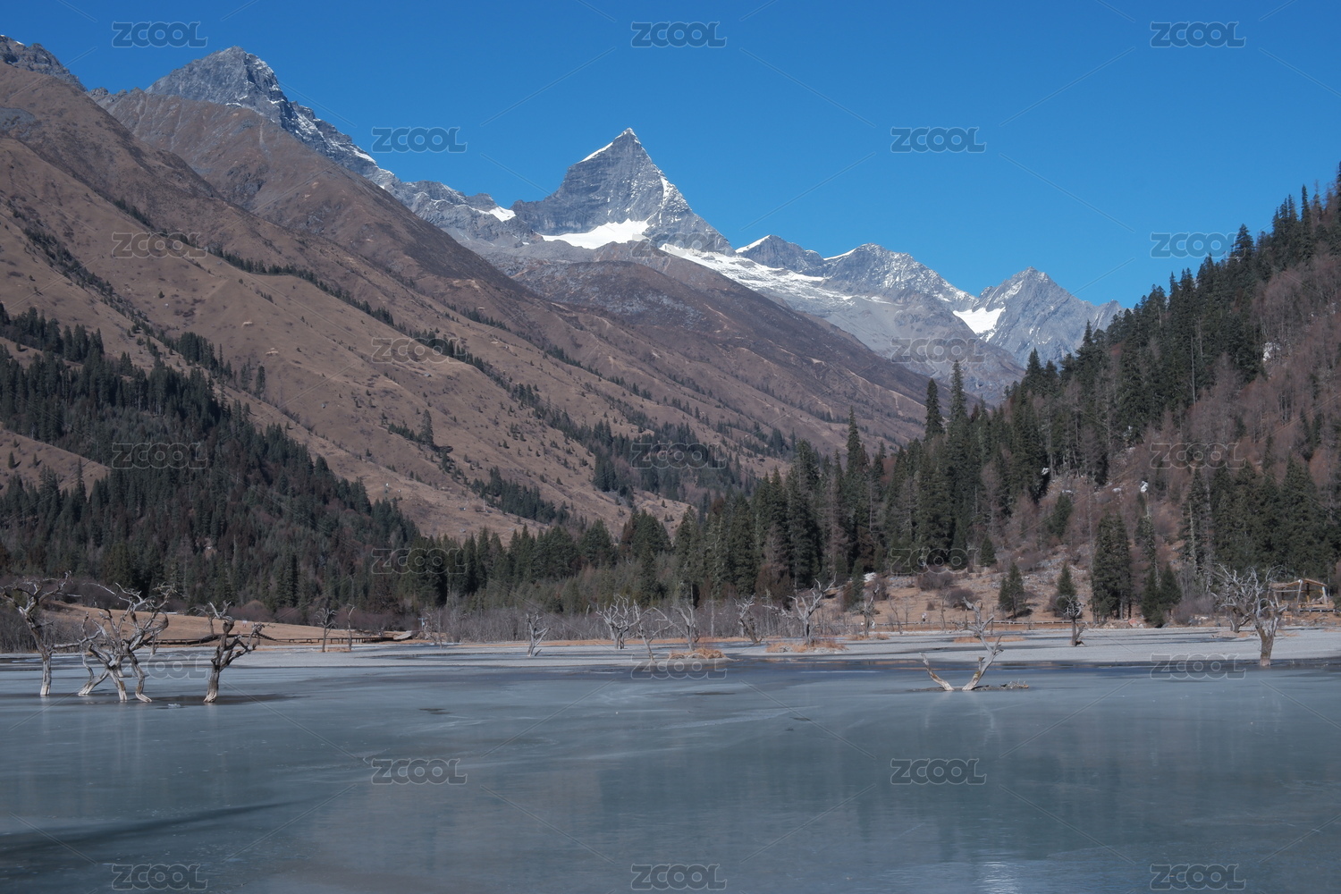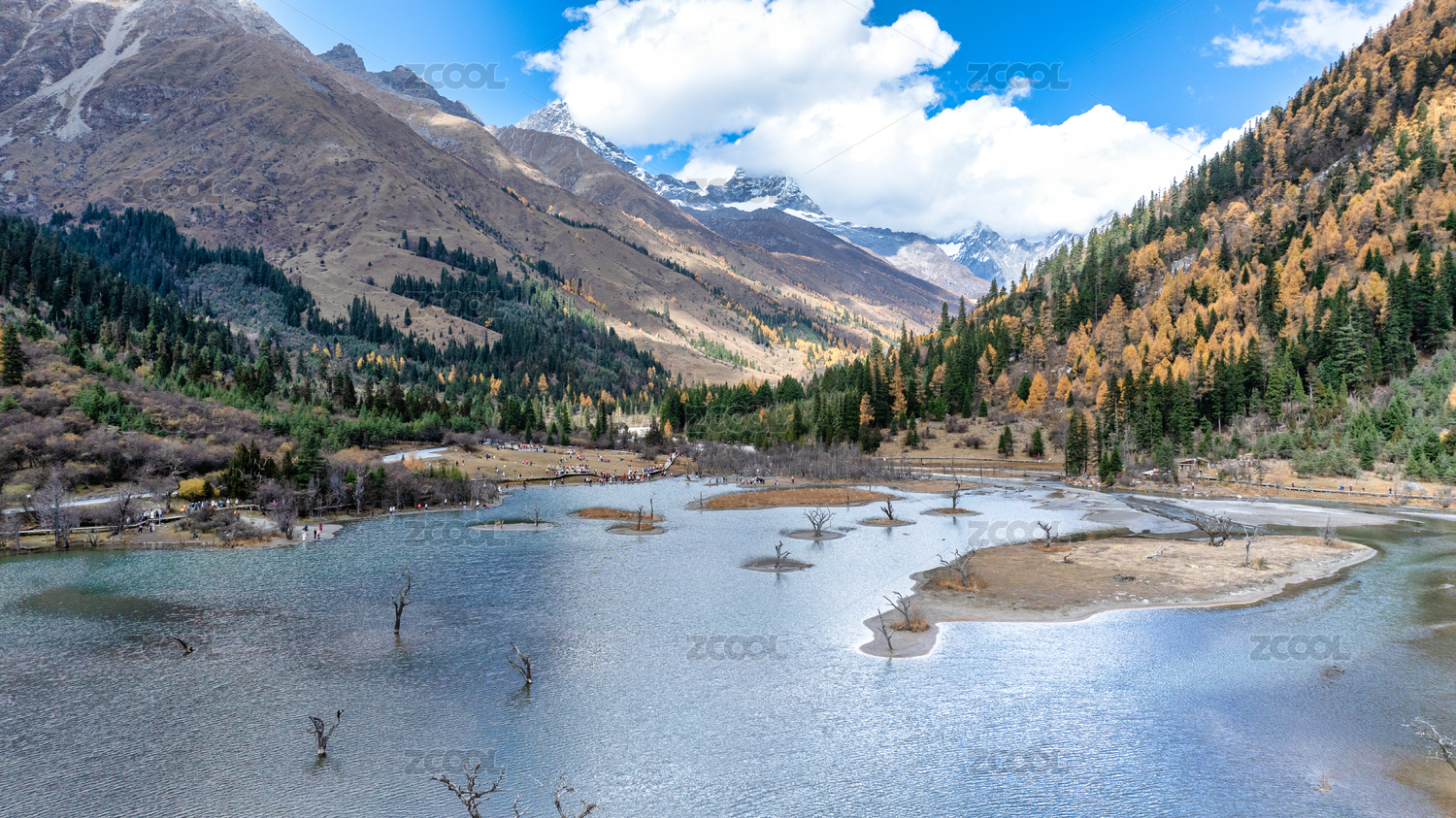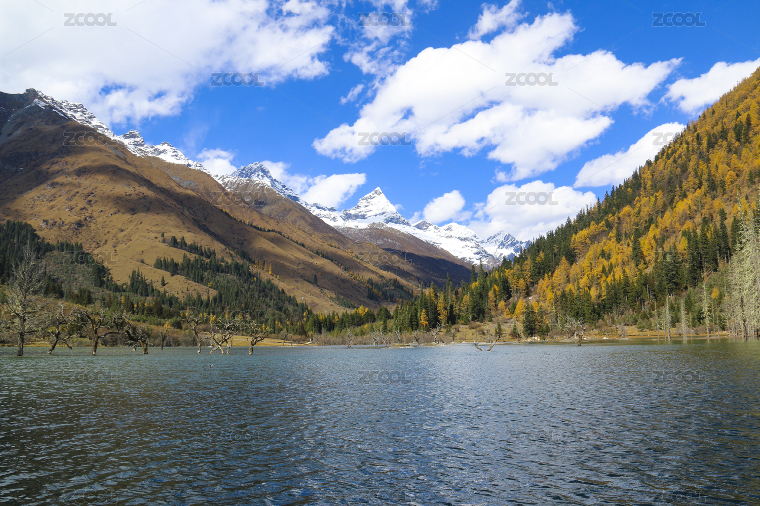 四川省甘孜藏族自治州四姑娘山秋季雪山彩林碧水景观