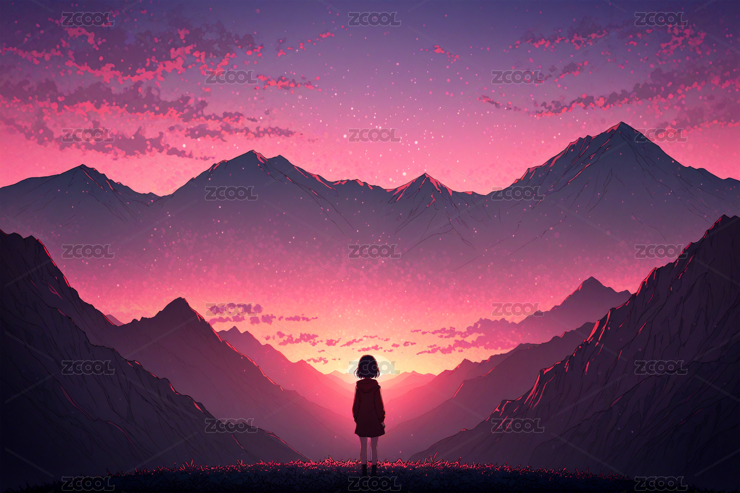 蓝天白云下人物伫立雪山之巅俯瞰云海插画