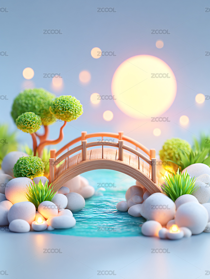 3d卡通圆月小桥流水