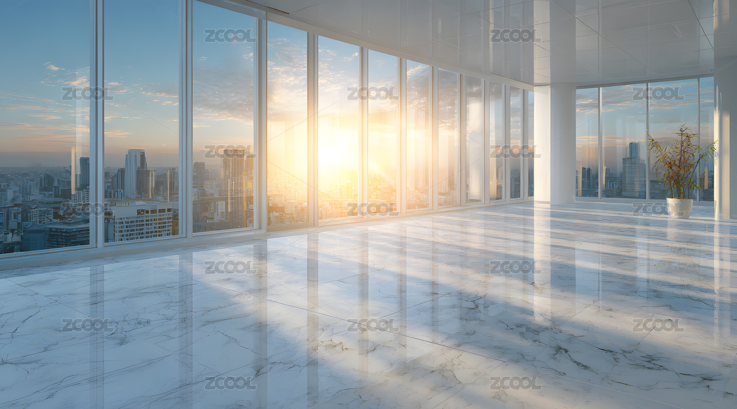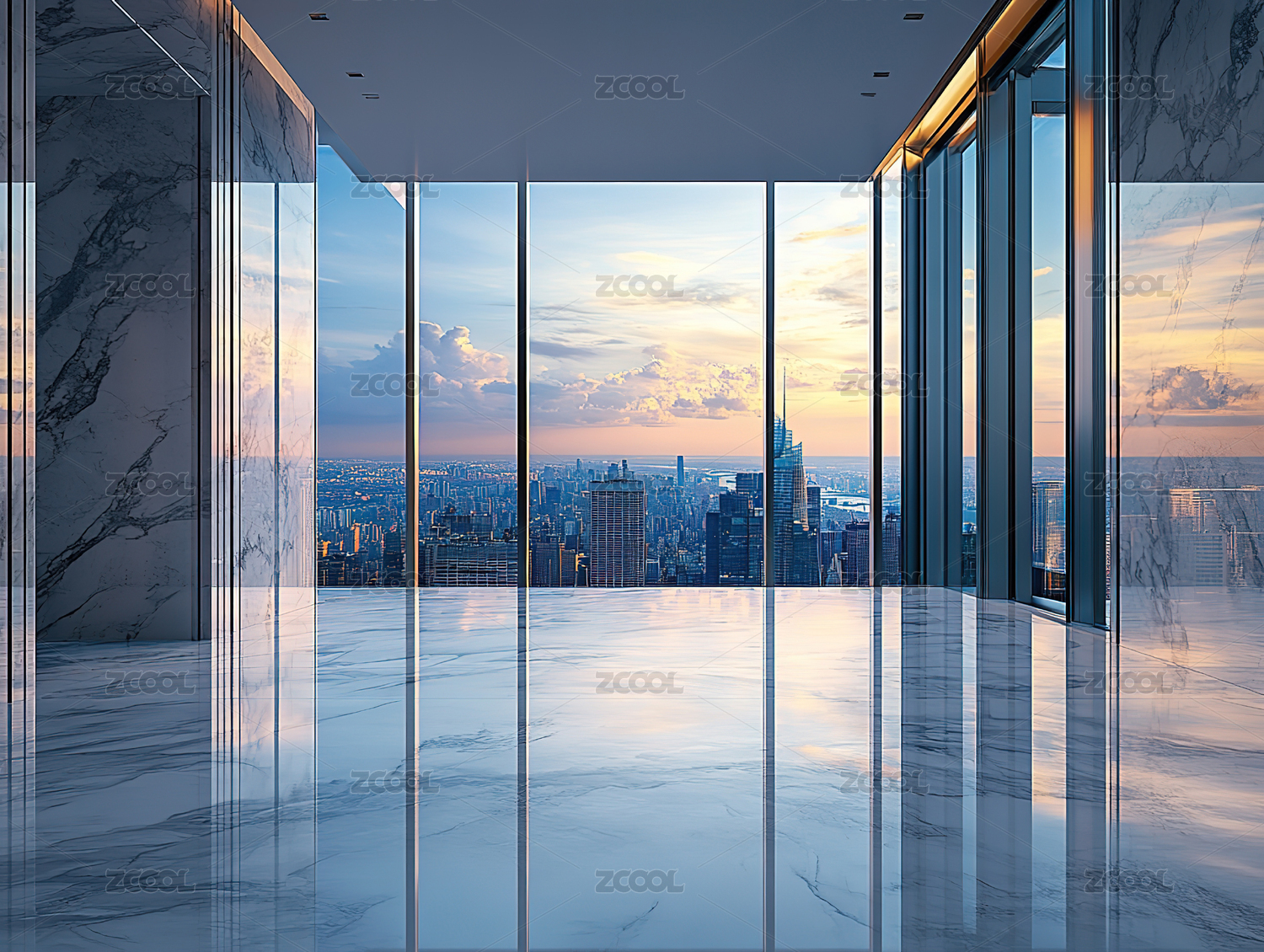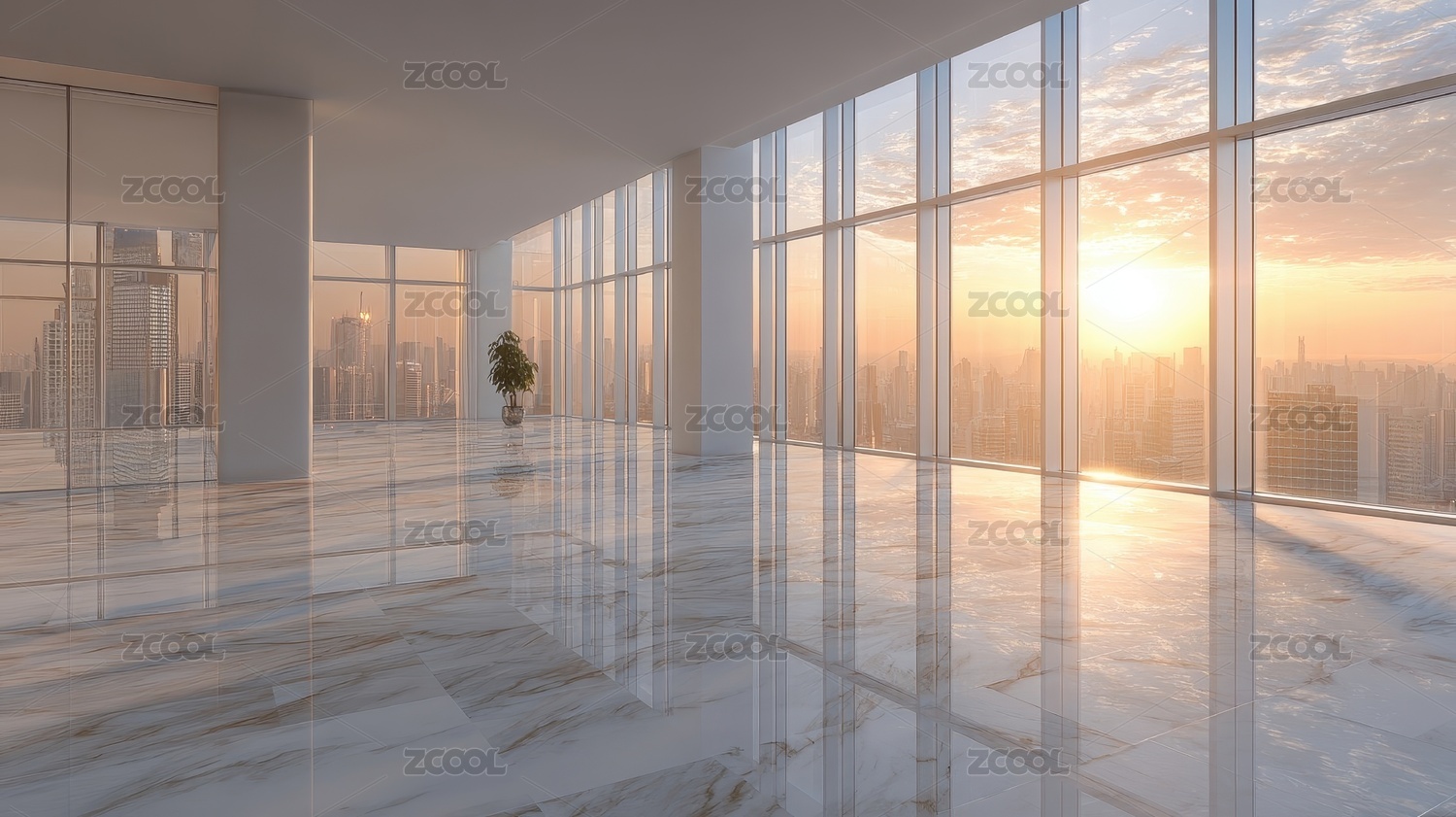 落地窗,大理石地板,室内植物,城市景观,日落,阳光,天空,云彩,高楼大厦,繁华都市