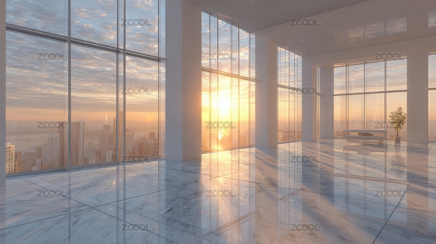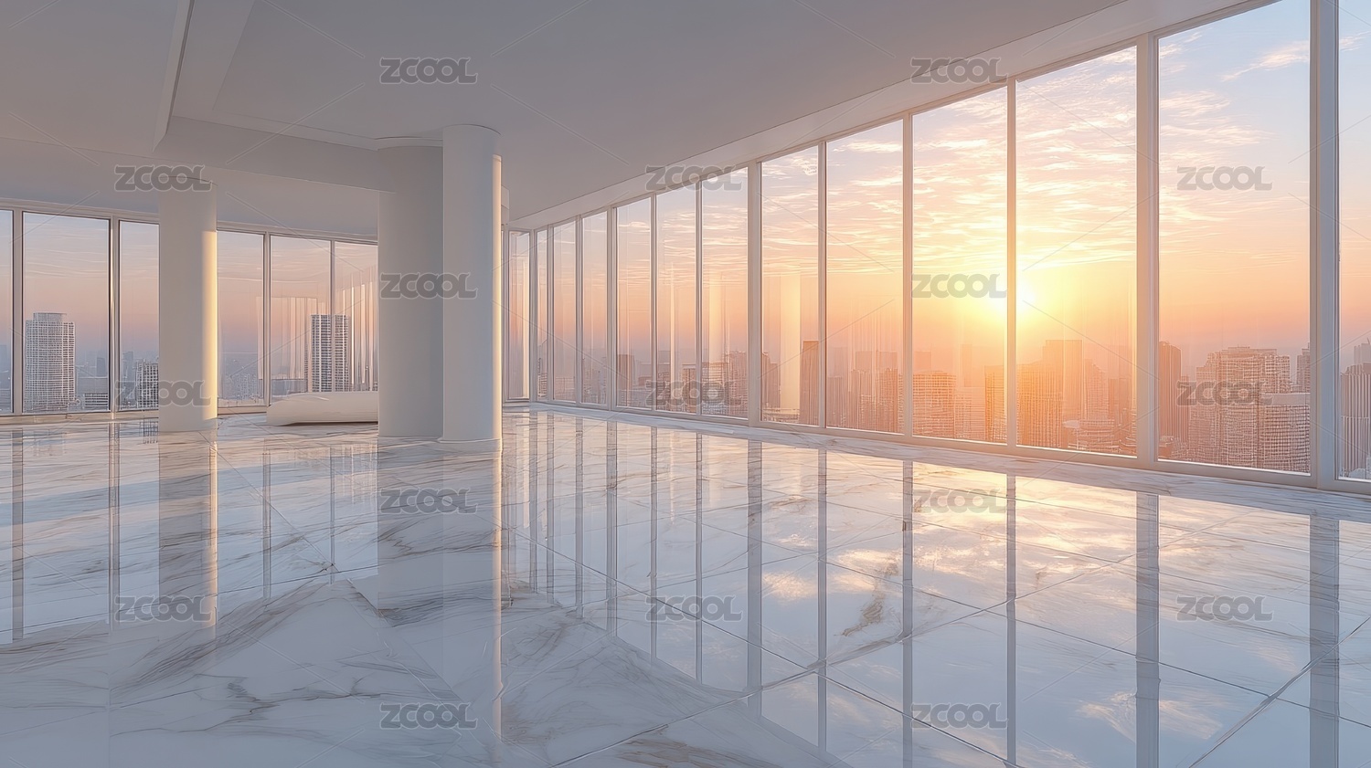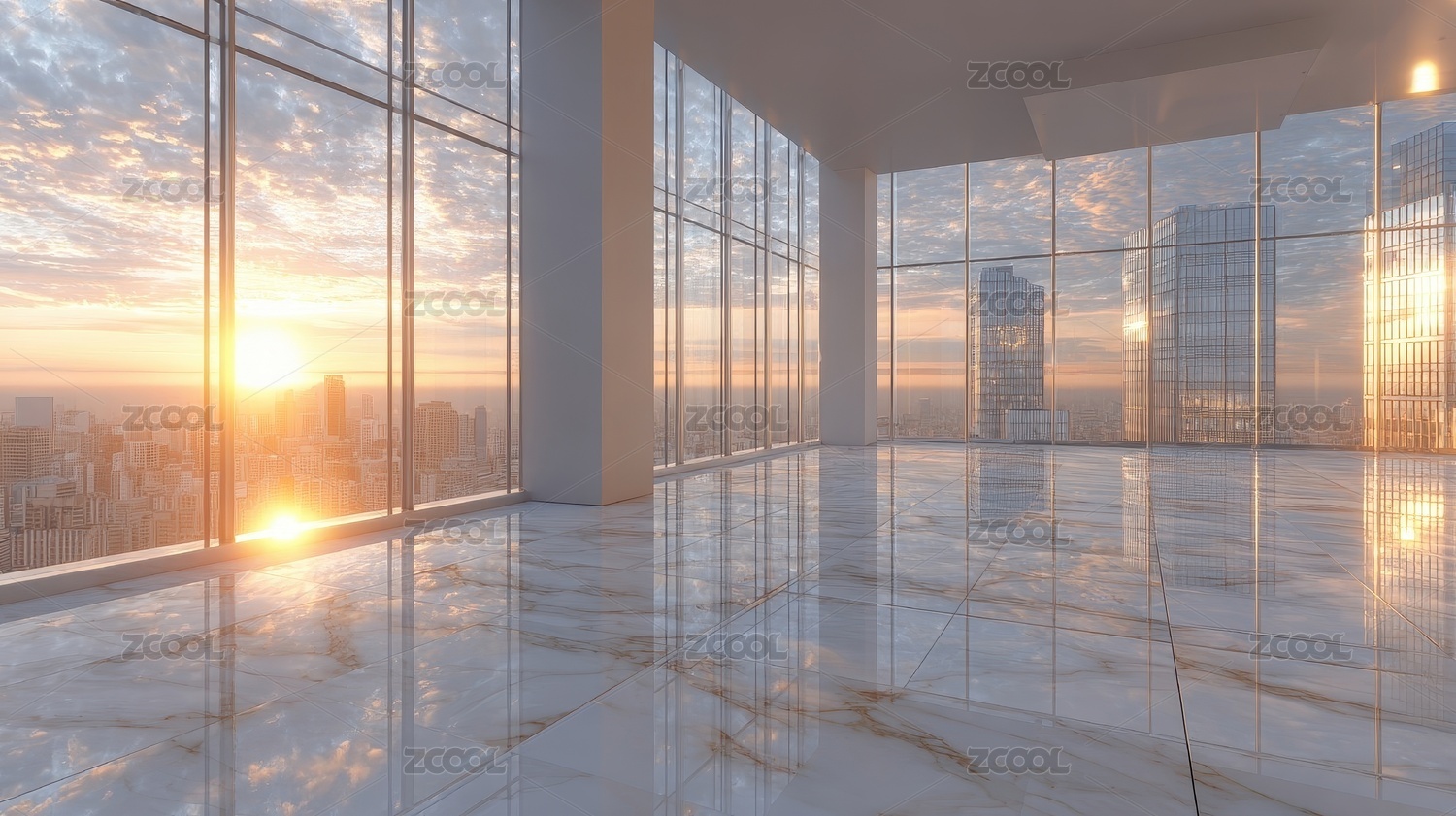 落地窗,大理石地板,室内植物,城市景观,日落,阳光,天空,云彩,高楼大厦,繁华都市