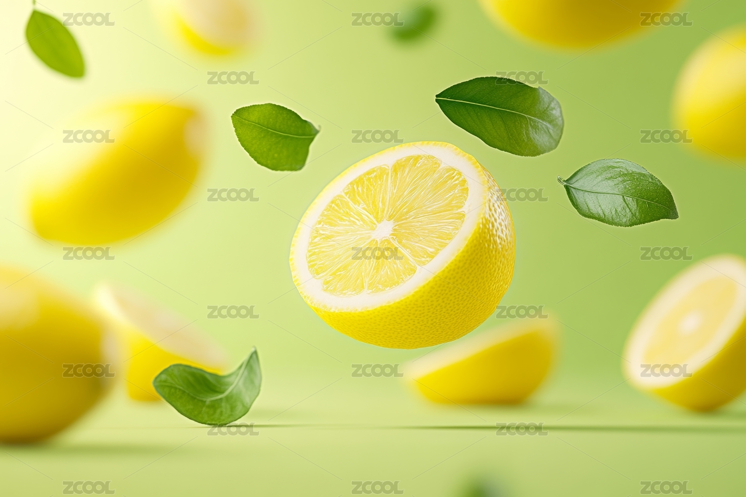 黄色背景下飞舞的柠檬及切片