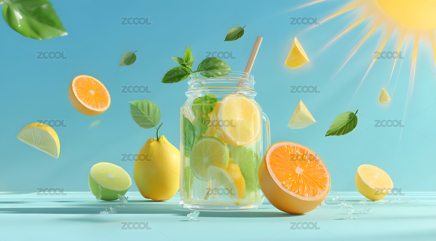柠檬,橙子,薄荷,玻璃瓶,饮料,水果,夏日,清凉,阳光,切片