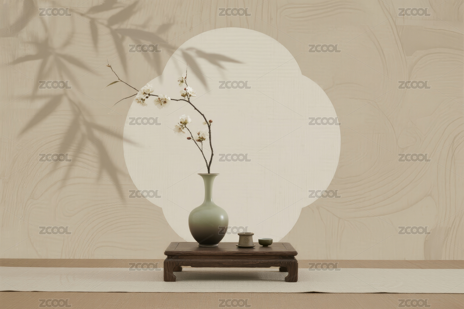 3d渲染新中式条案和陶瓷花瓶家居装修图