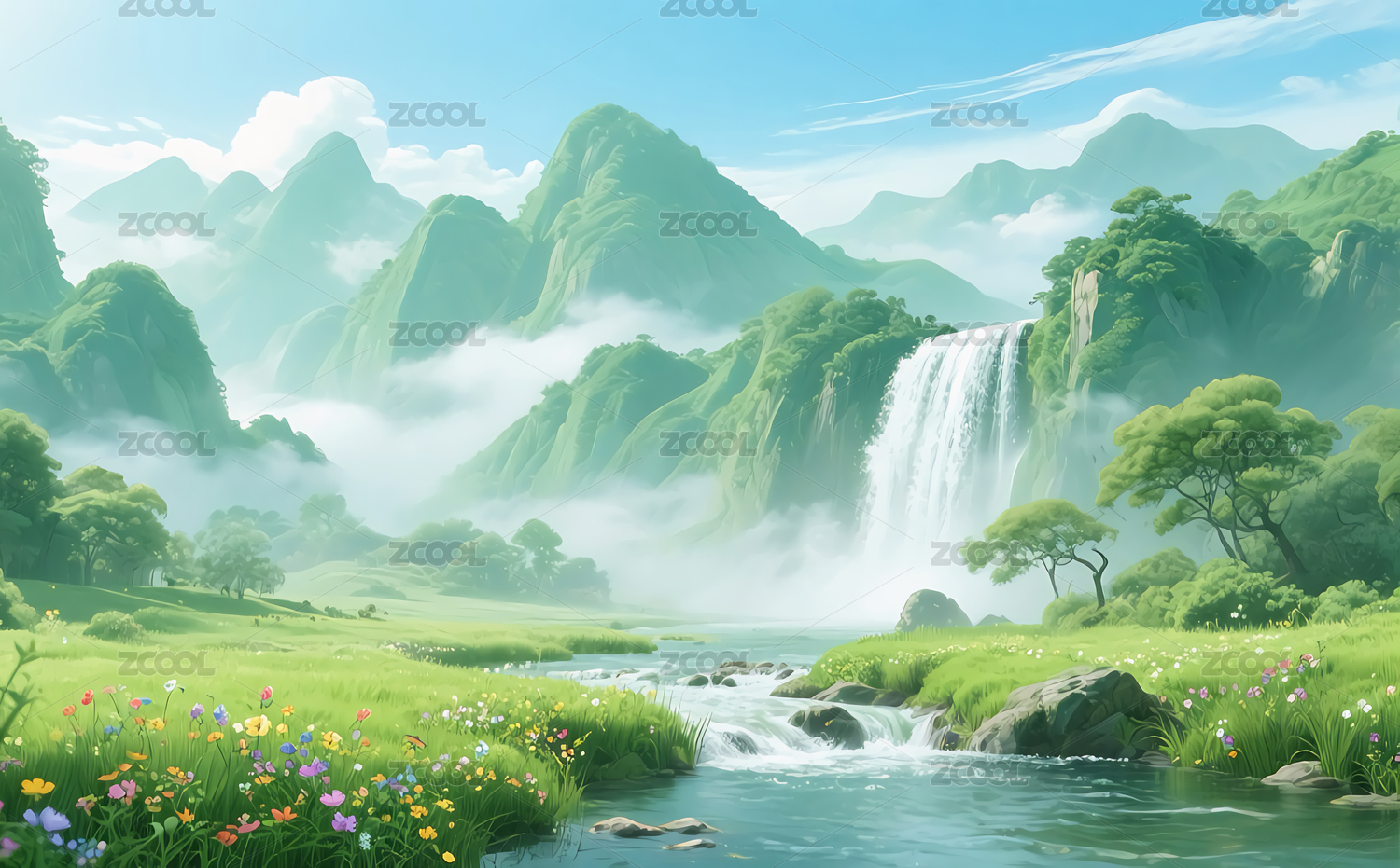唯美春天森林瀑布风景插画
