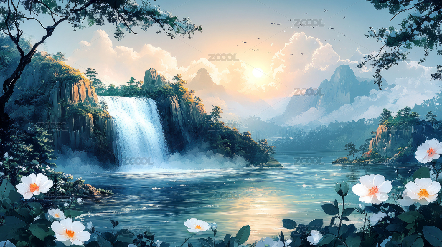 中国风开满鲜花的山水瀑布美景自然风光