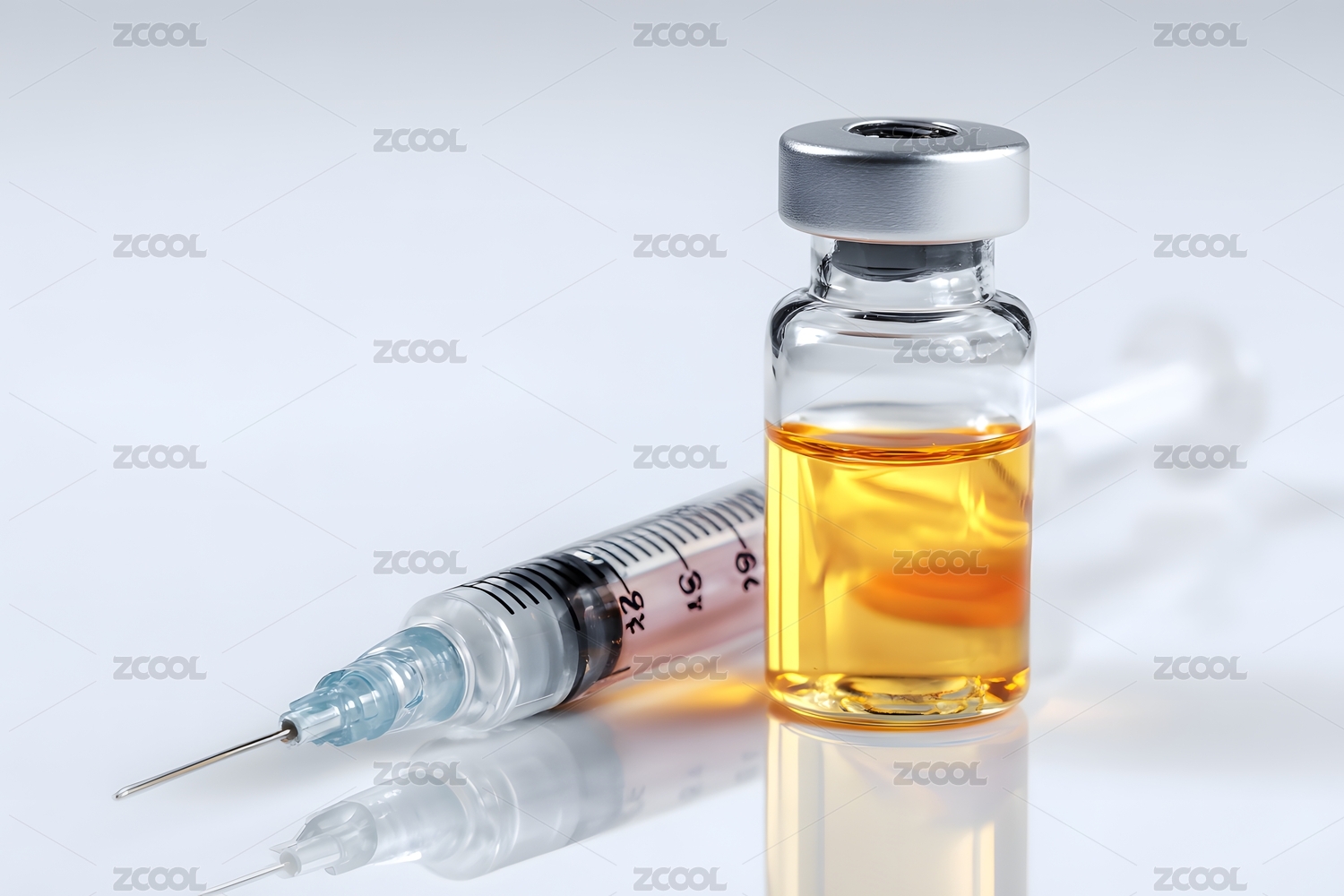 医疗瓶旁边注射器特写