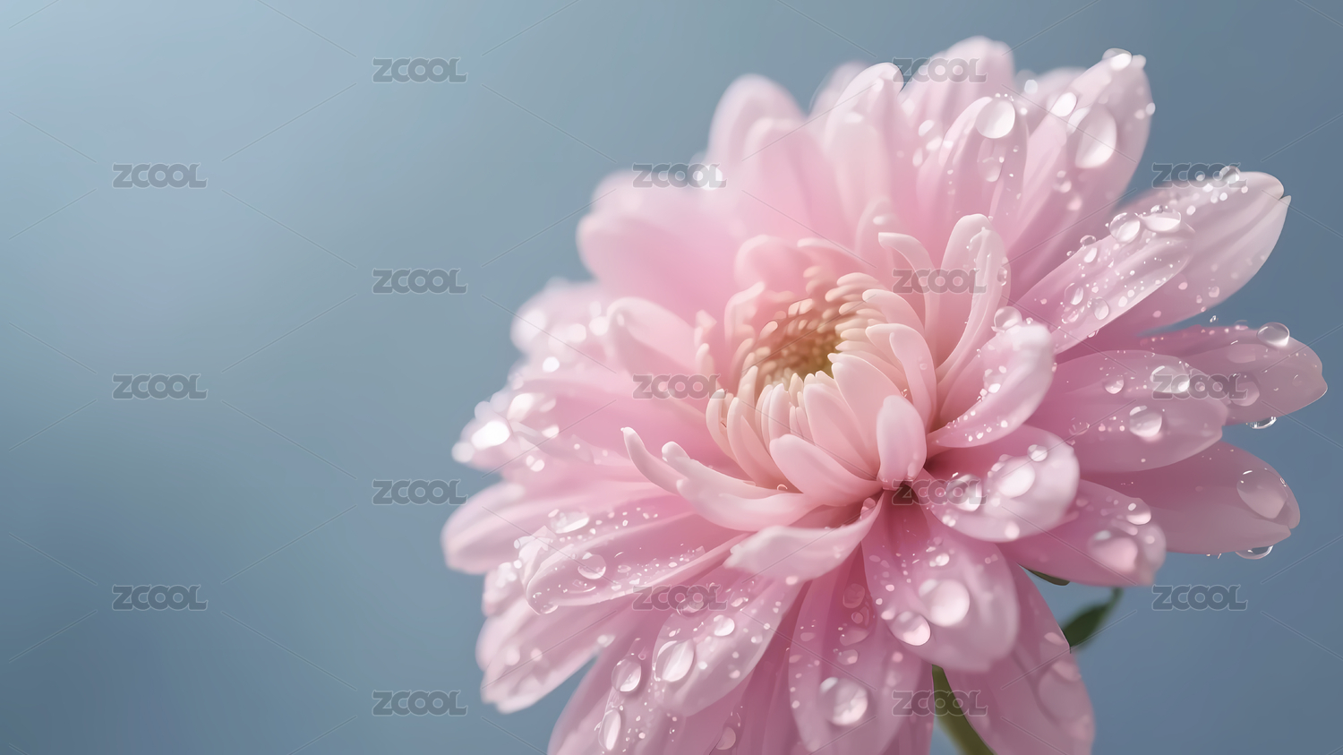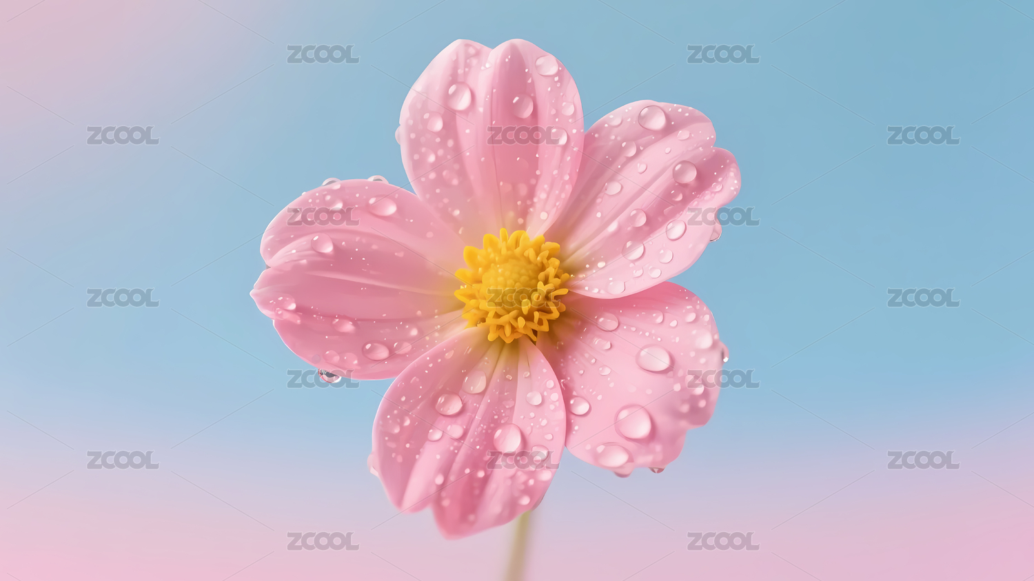背景,粉色,浅蓝,花朵,花瓣,花蕊,黄色,粉红,水珠,晶莹