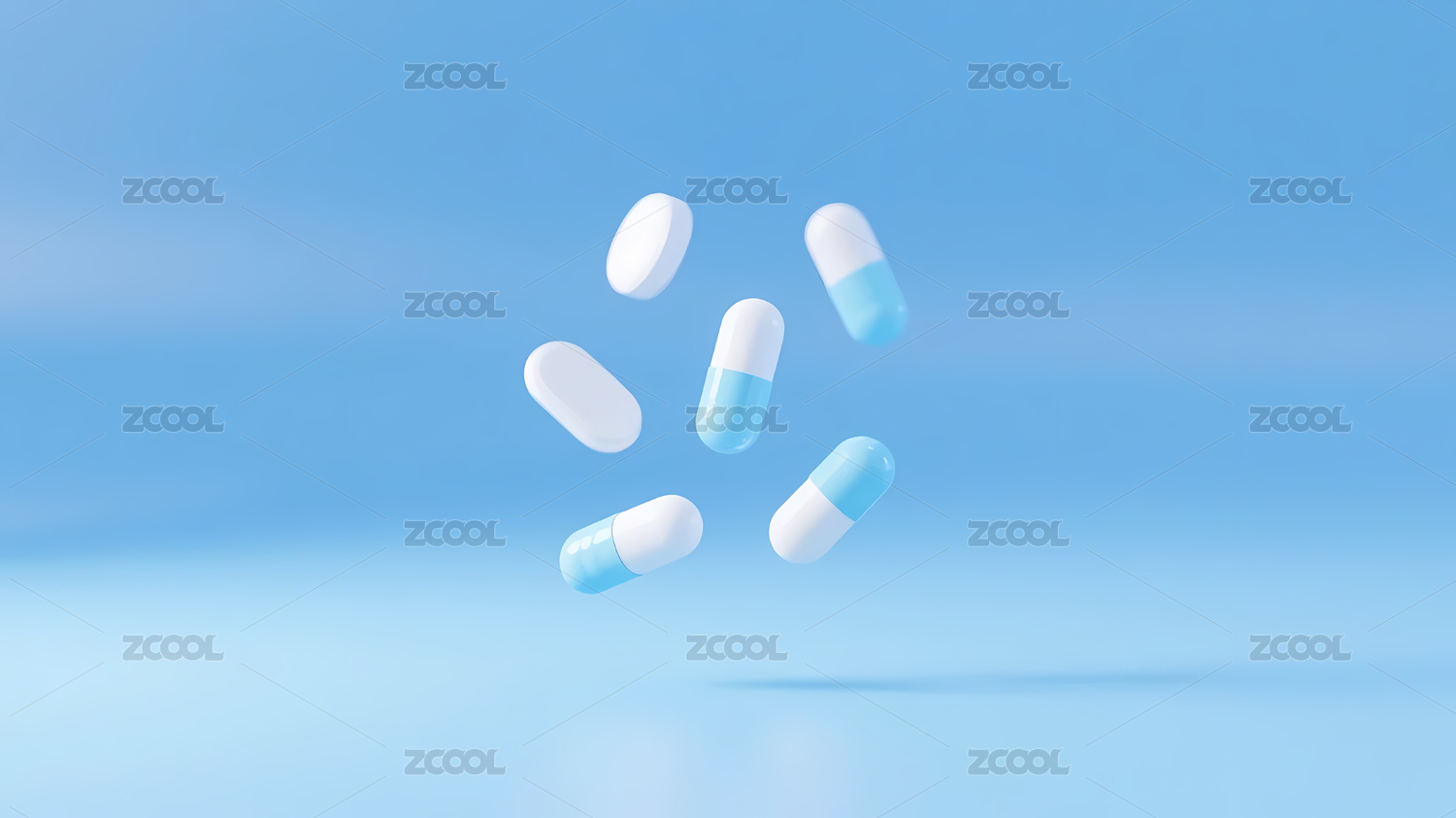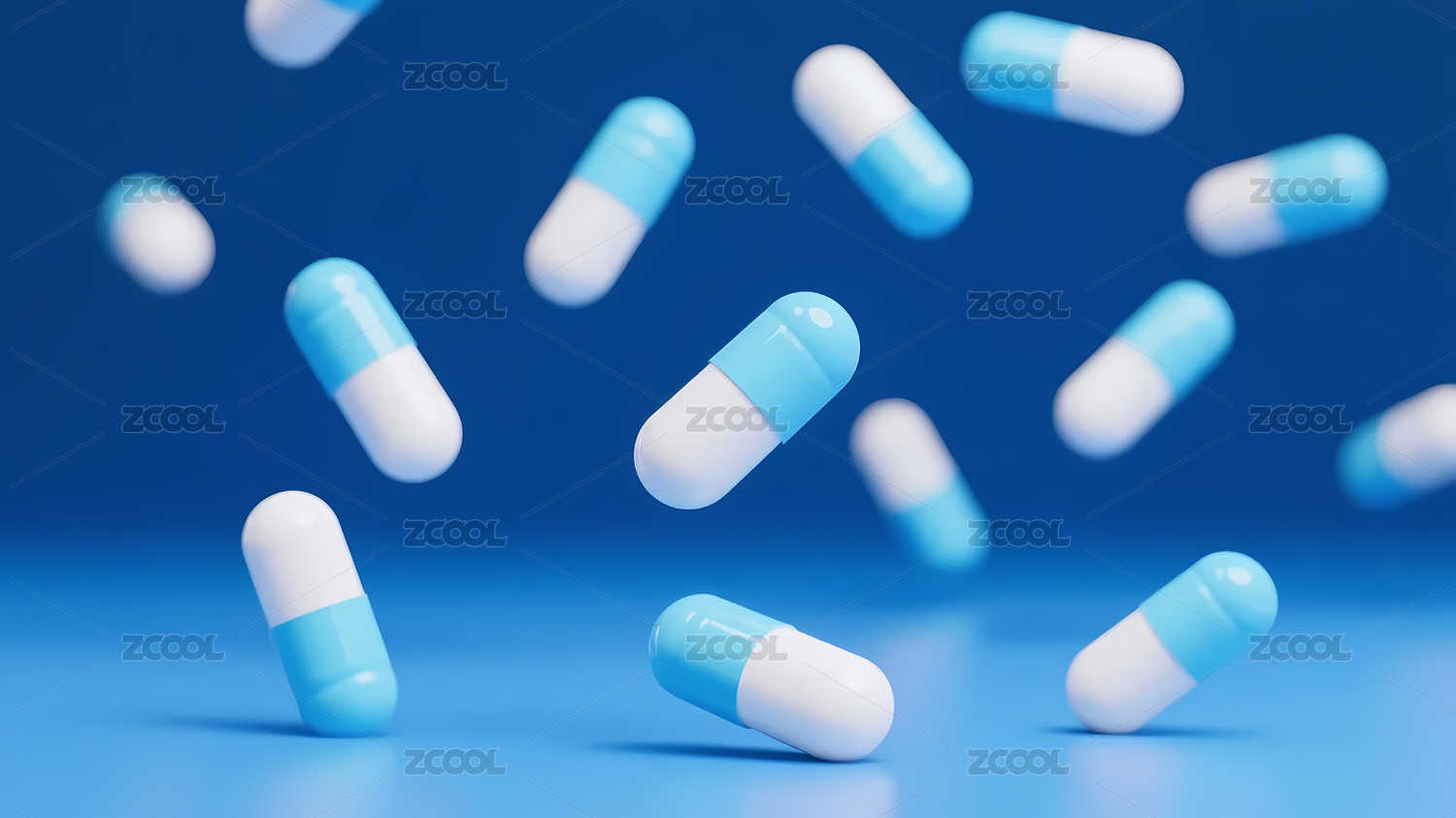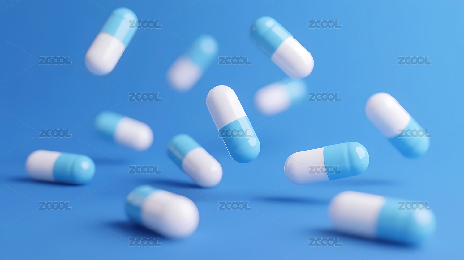 主体,背景,简洁,蓝色,白色,胶囊,药片,漂浮,下落,动态