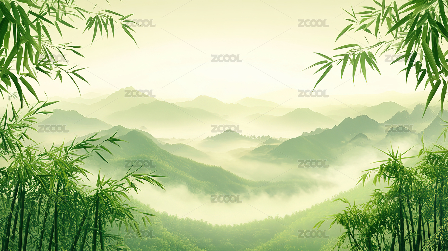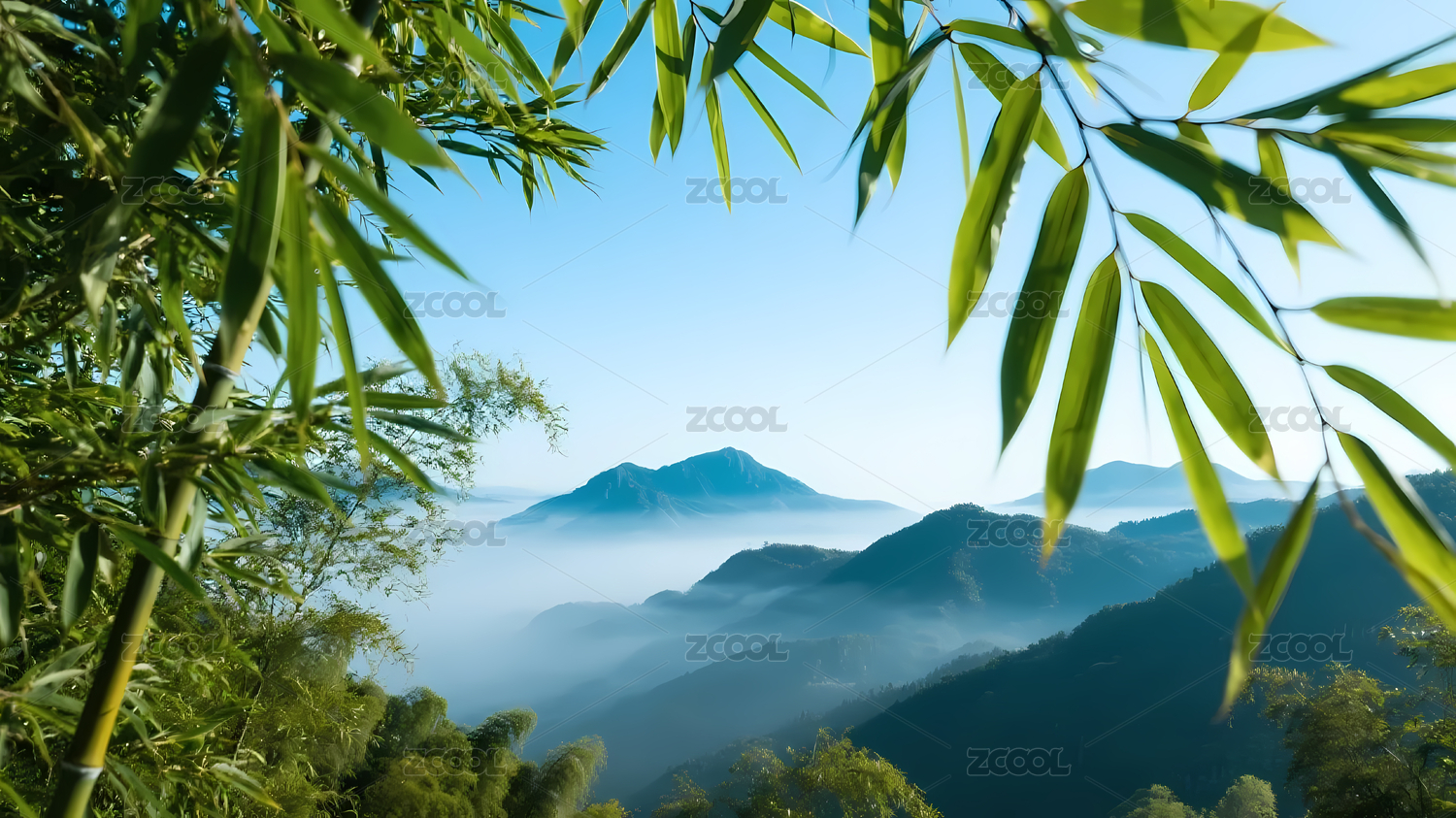 背景,主体,宁静,绿色,竹叶,蓝天,薄雾,山脉,自然,清澈