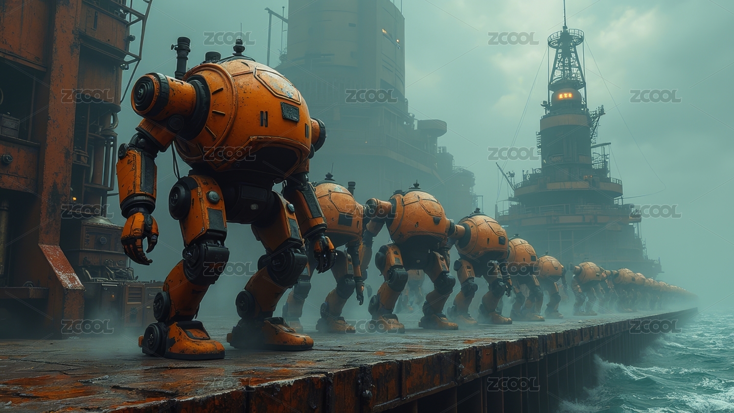 机械生物,科幻氛围,城市废墟,紫色烟雾,工业元素