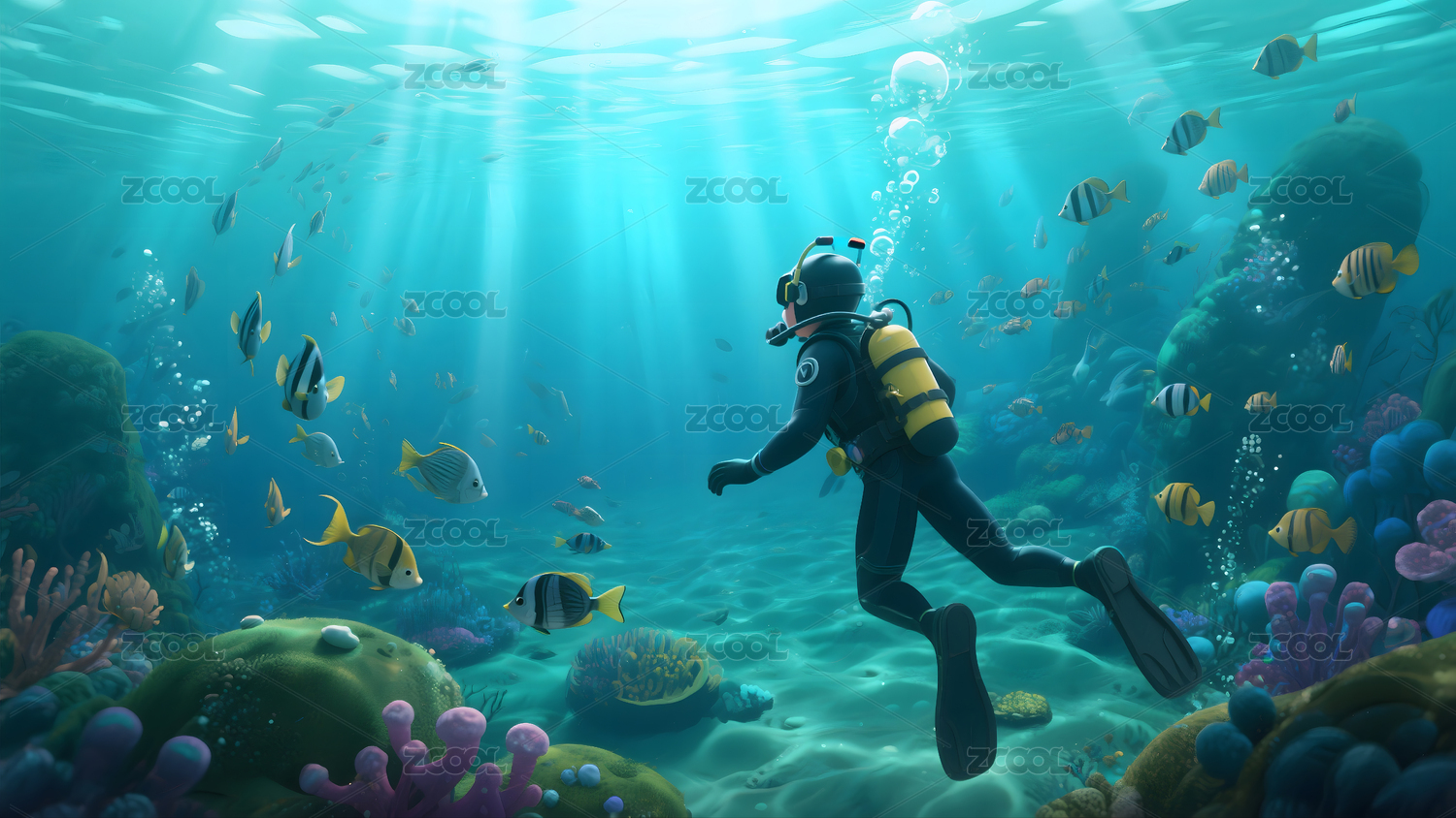 深海潜水员与珊瑚礁鱼群