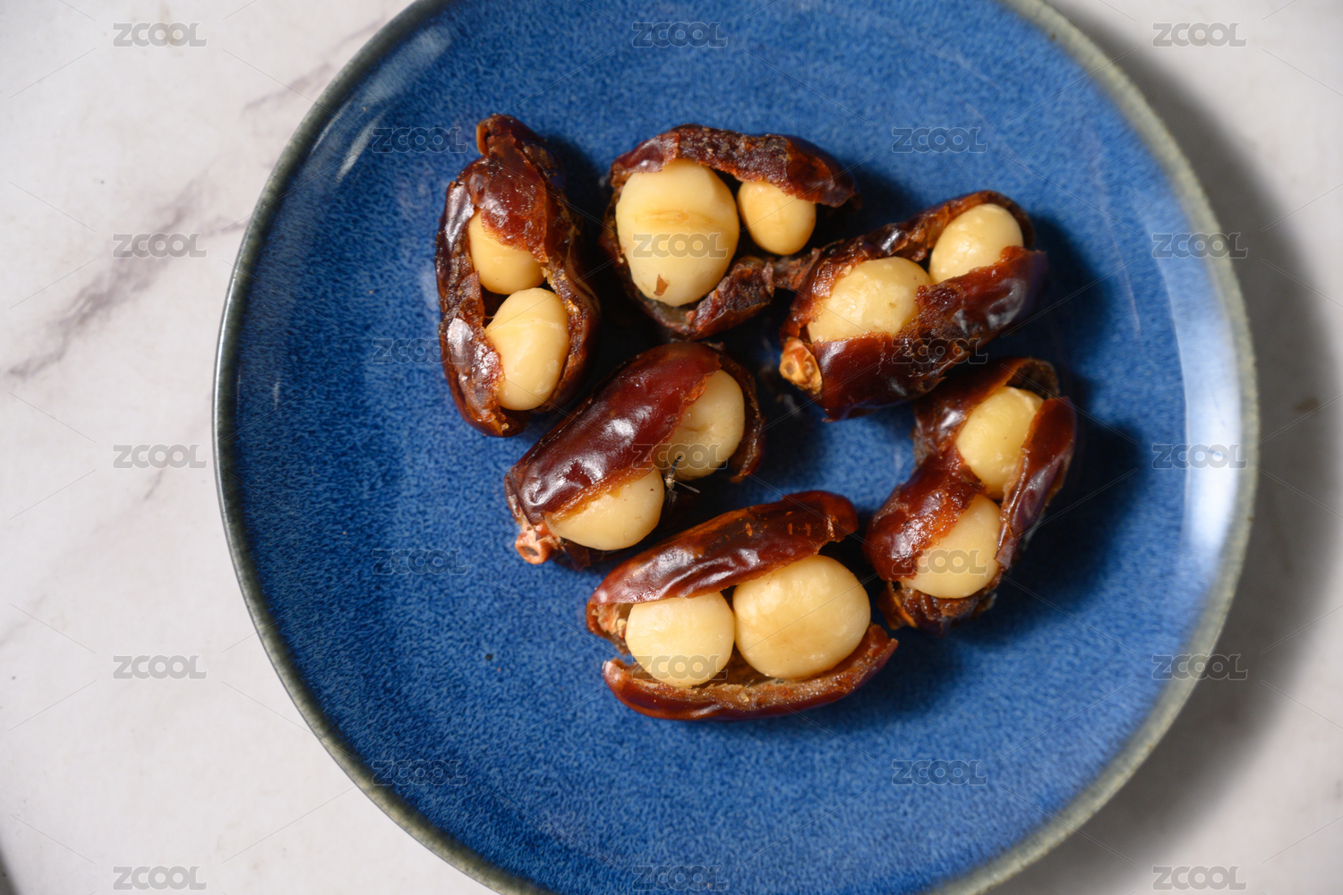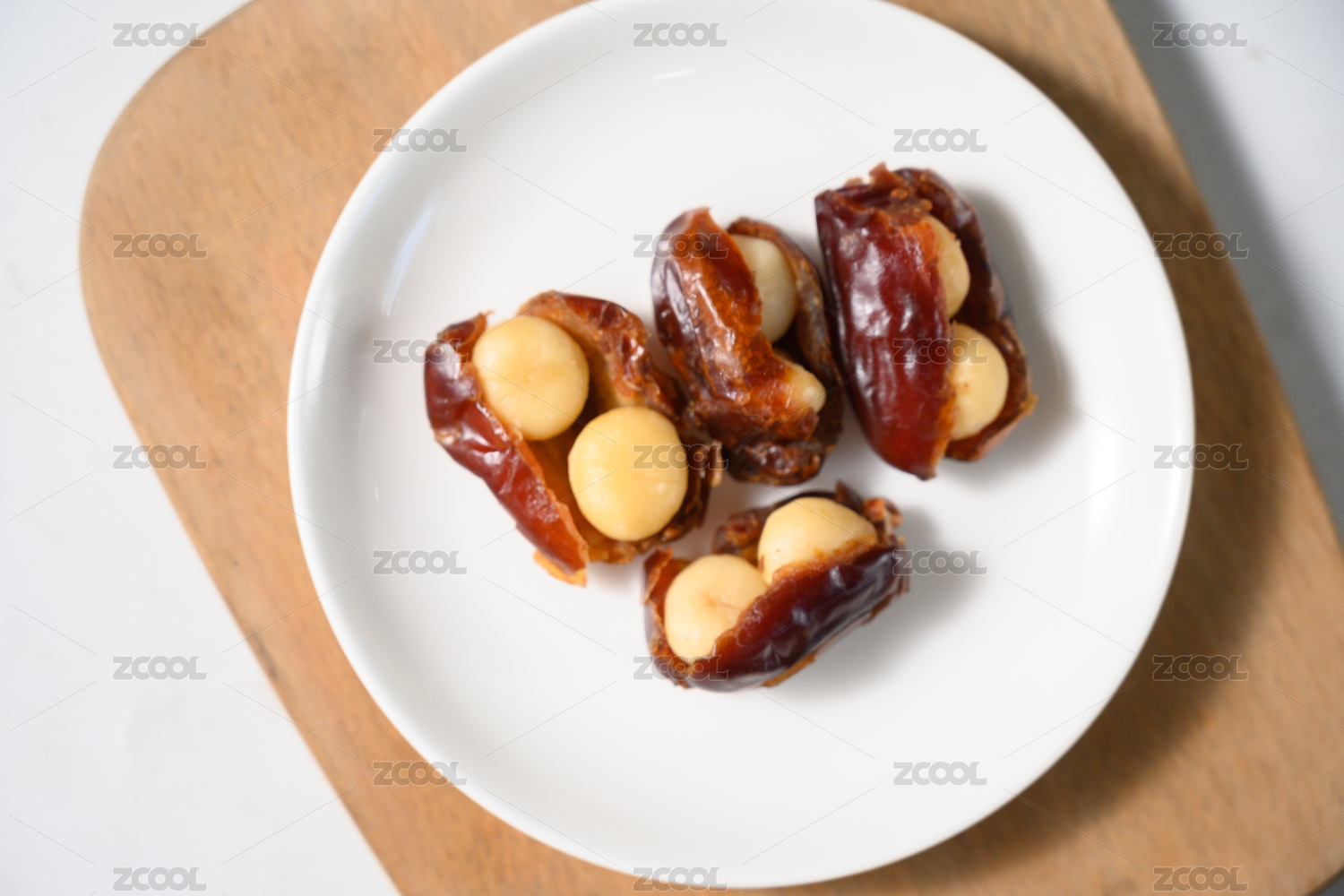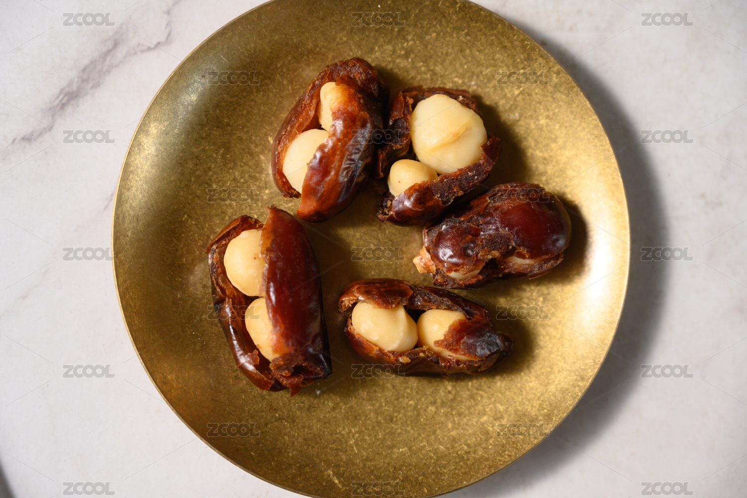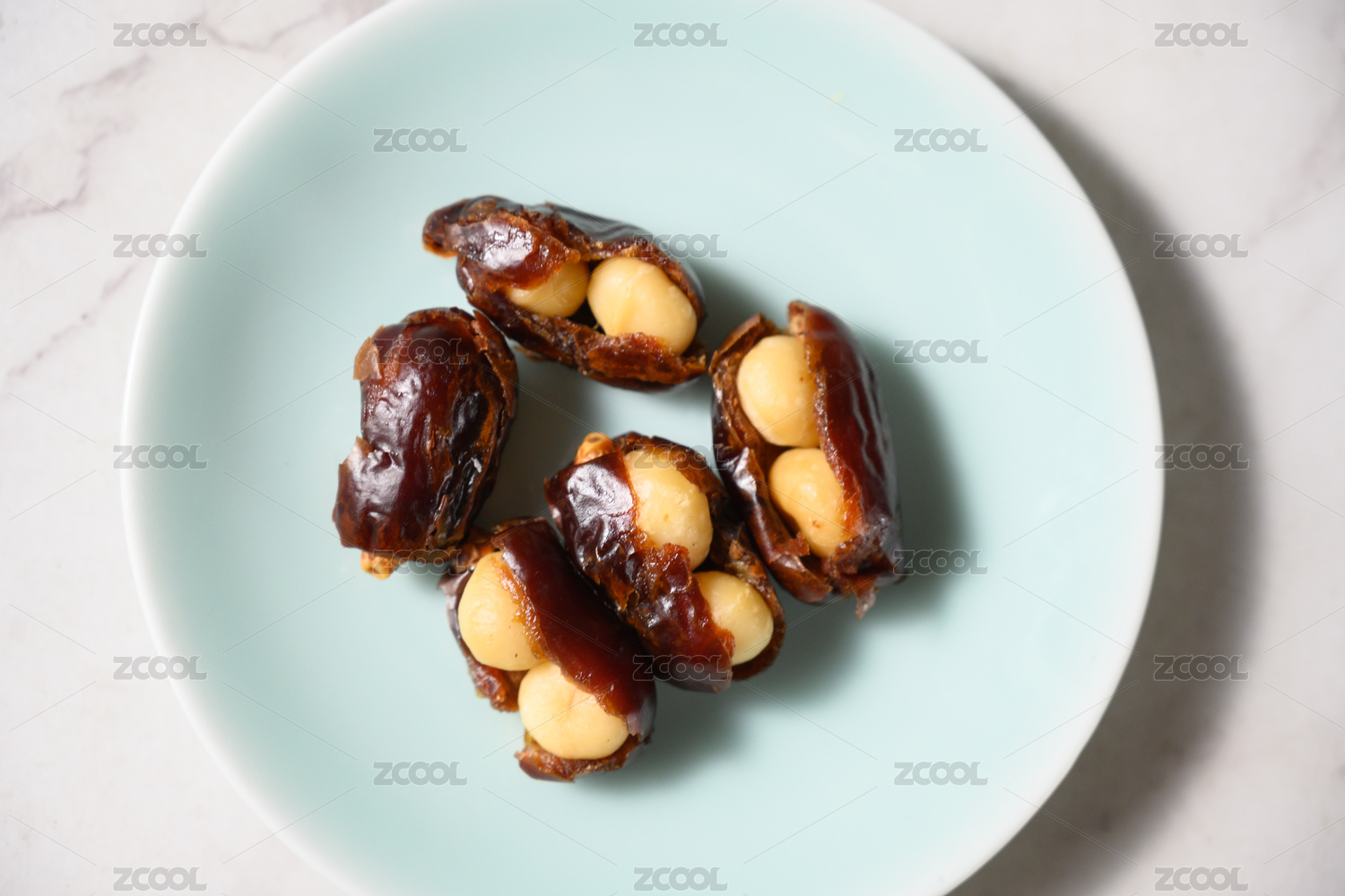 桌面上的盘子里的美味可口的椰枣夏威夷果仁