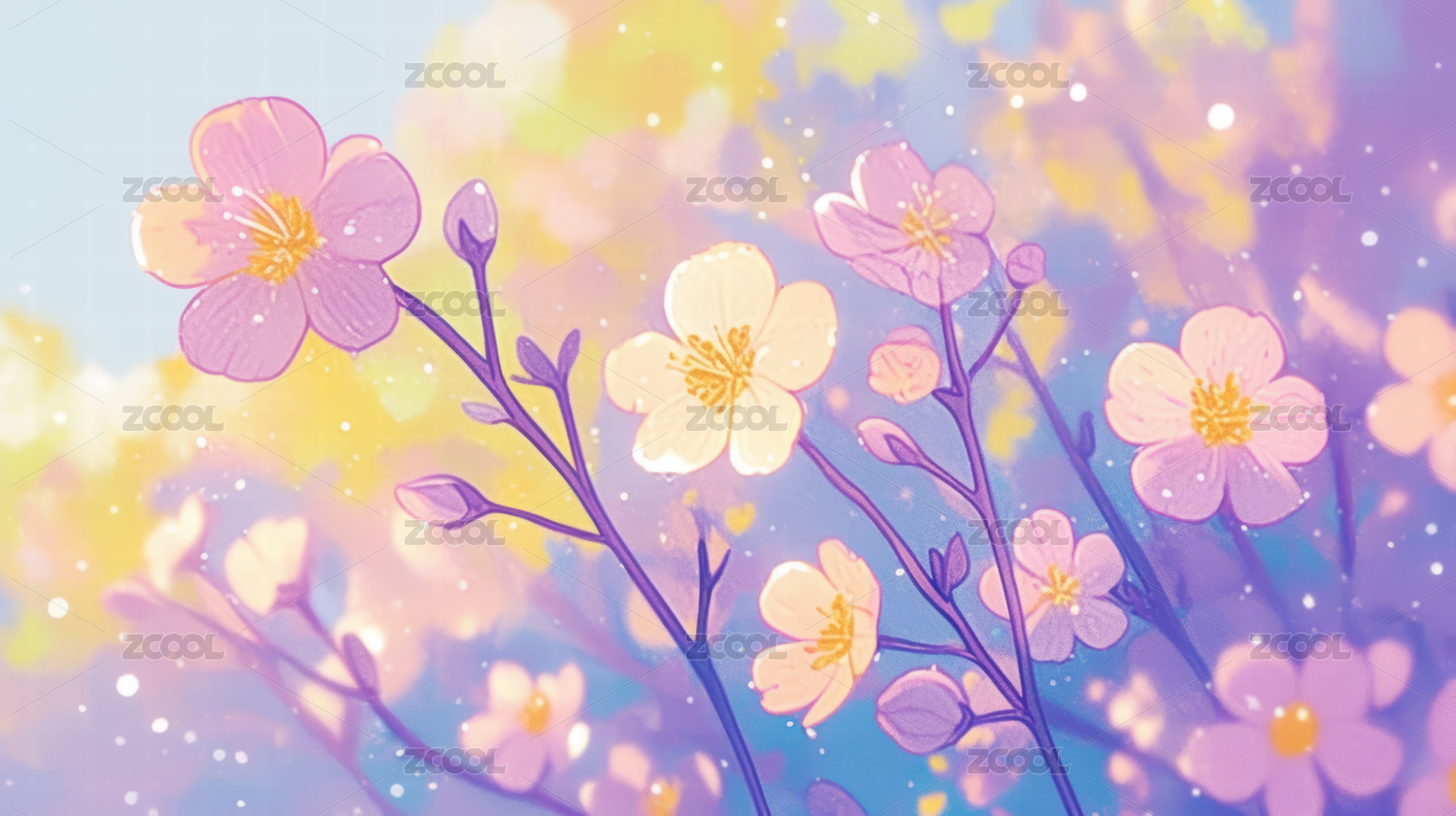 粉色樱花与黄色小花的梦幻背景