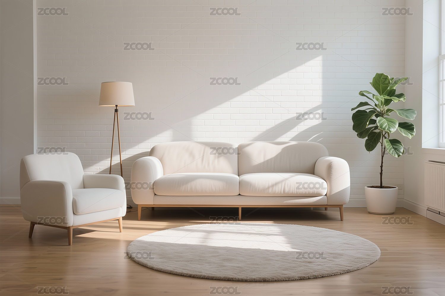 客厅内白色沙发圆形地毯盆栽空场景设计