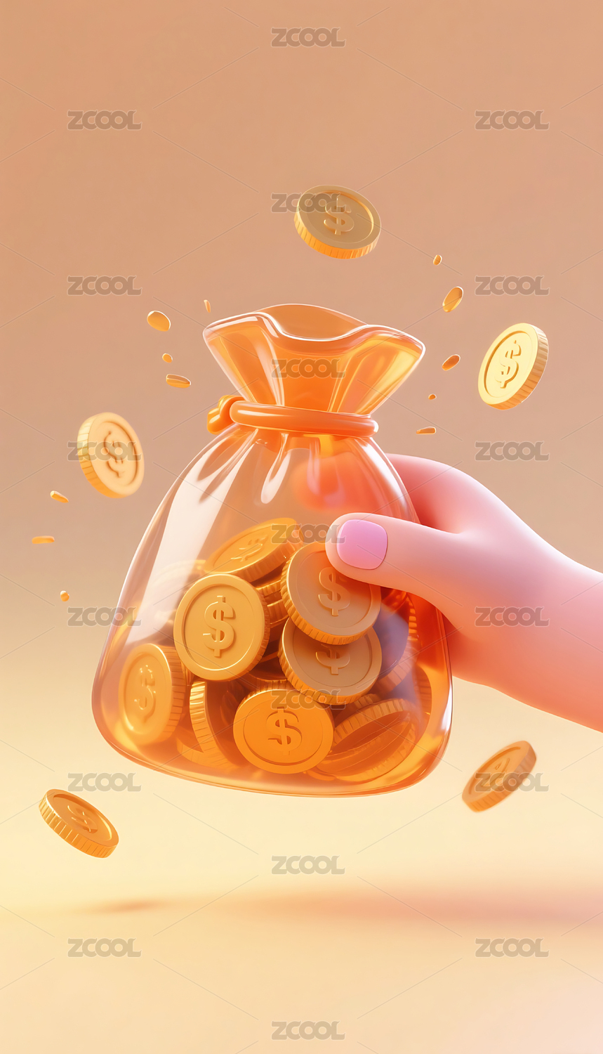 3D手拿橙色透明钱袋和金币模型