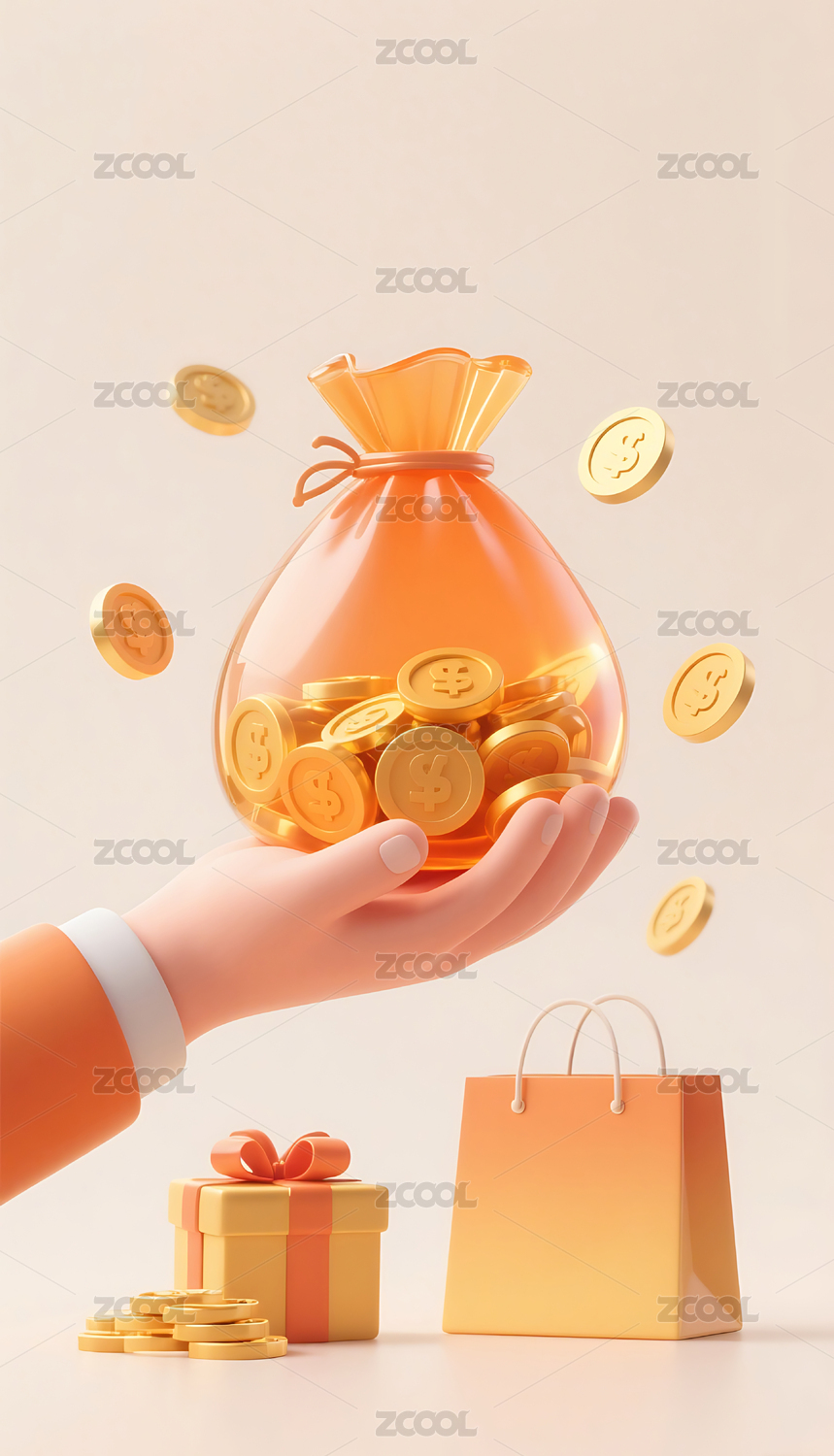 3D,橙色,电商,手,金币,福袋,模型,礼盒,背景,壁纸