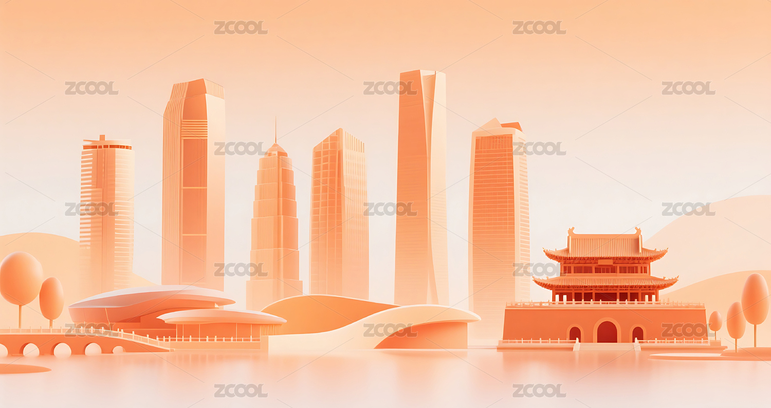 橙色现代城市建筑和古建筑插画背景壁纸