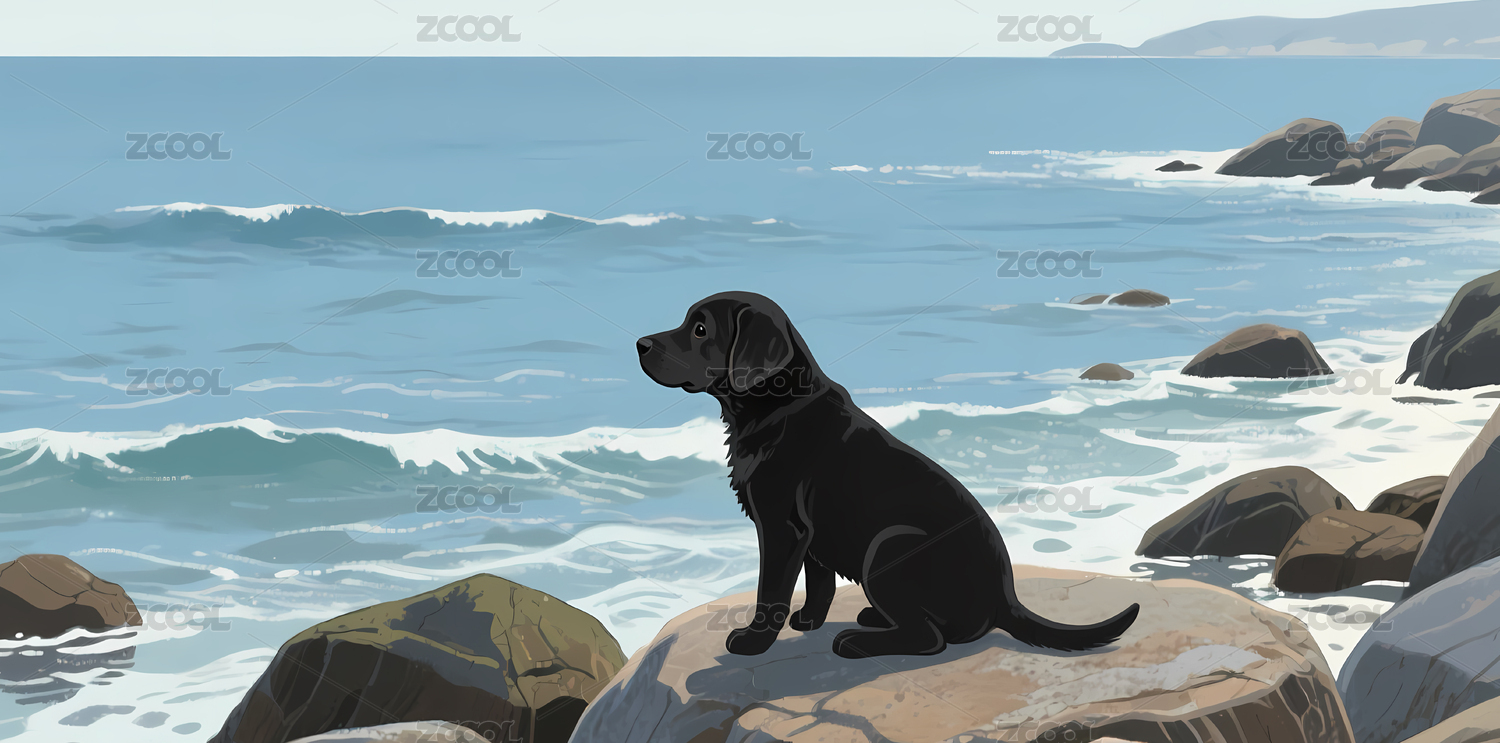 黑犬静坐岩石之上,远眺海浪