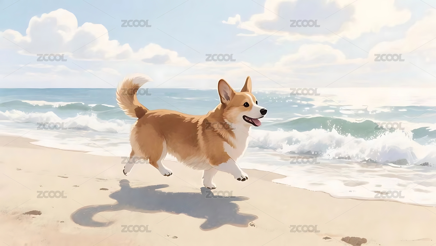 阳光海滩上奔跑的小狗