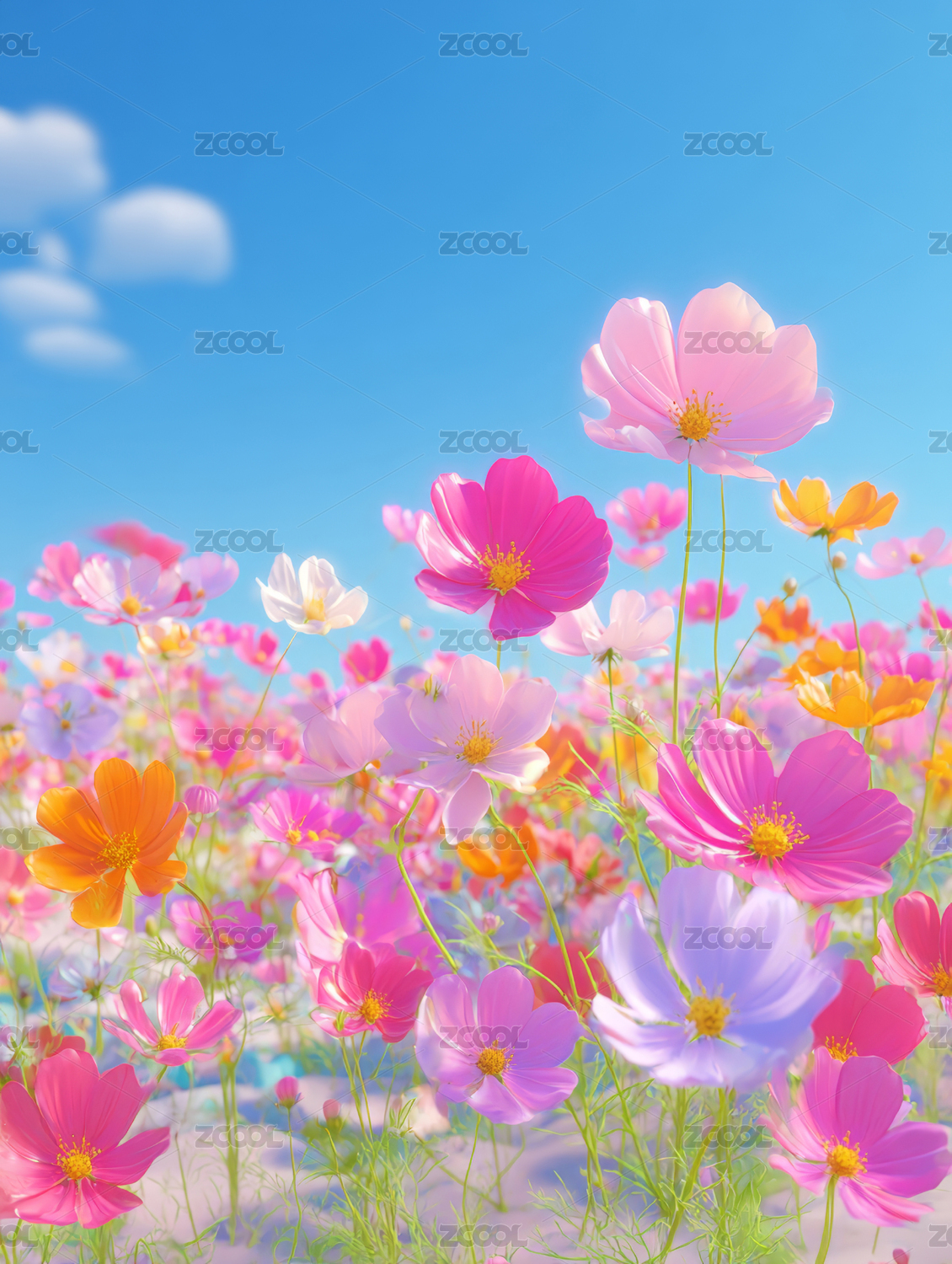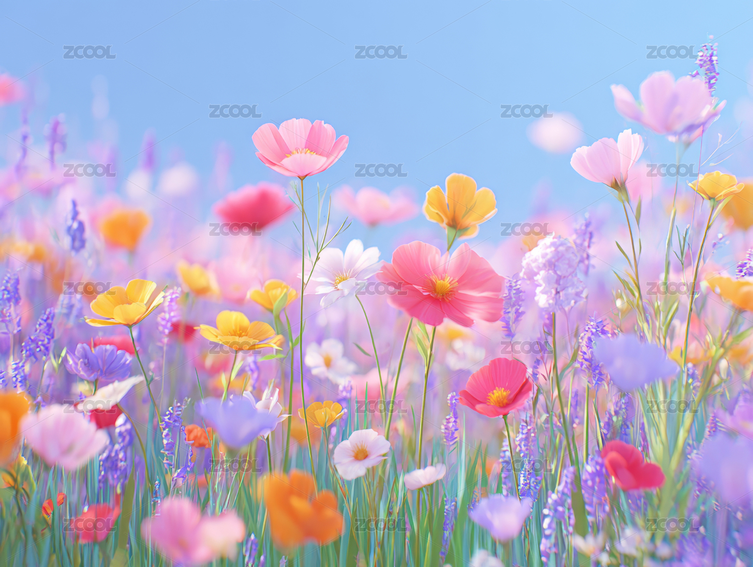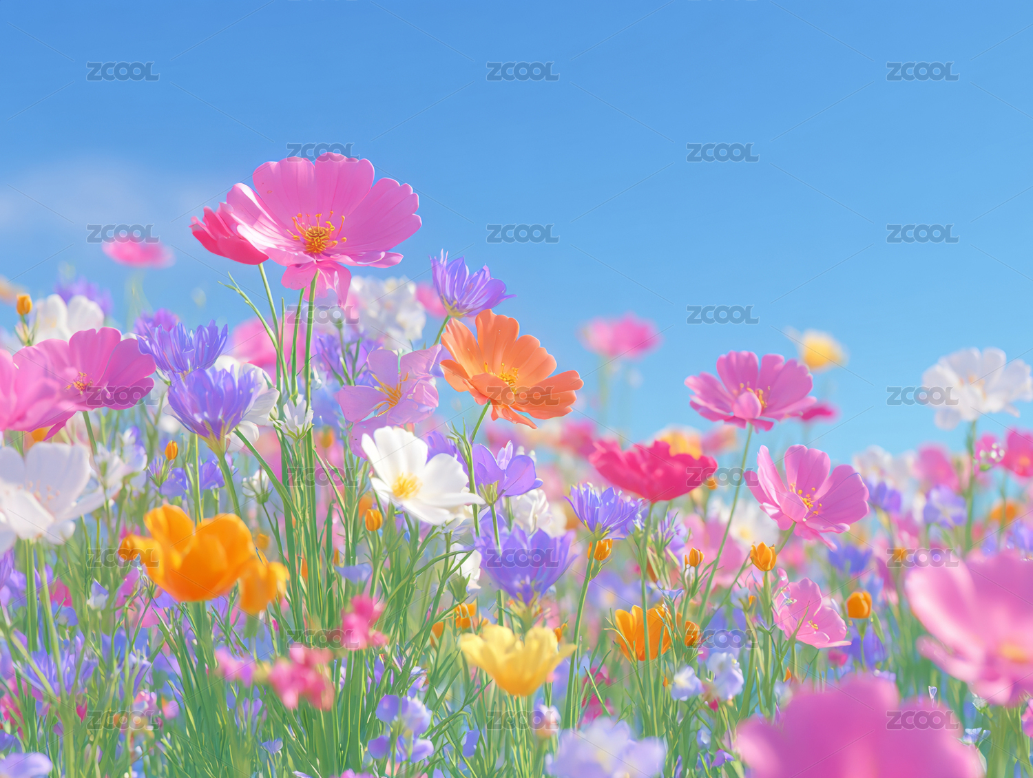 花朵,春天,蓝天,粉色,黄色,紫色,自然,户外,美丽,野花