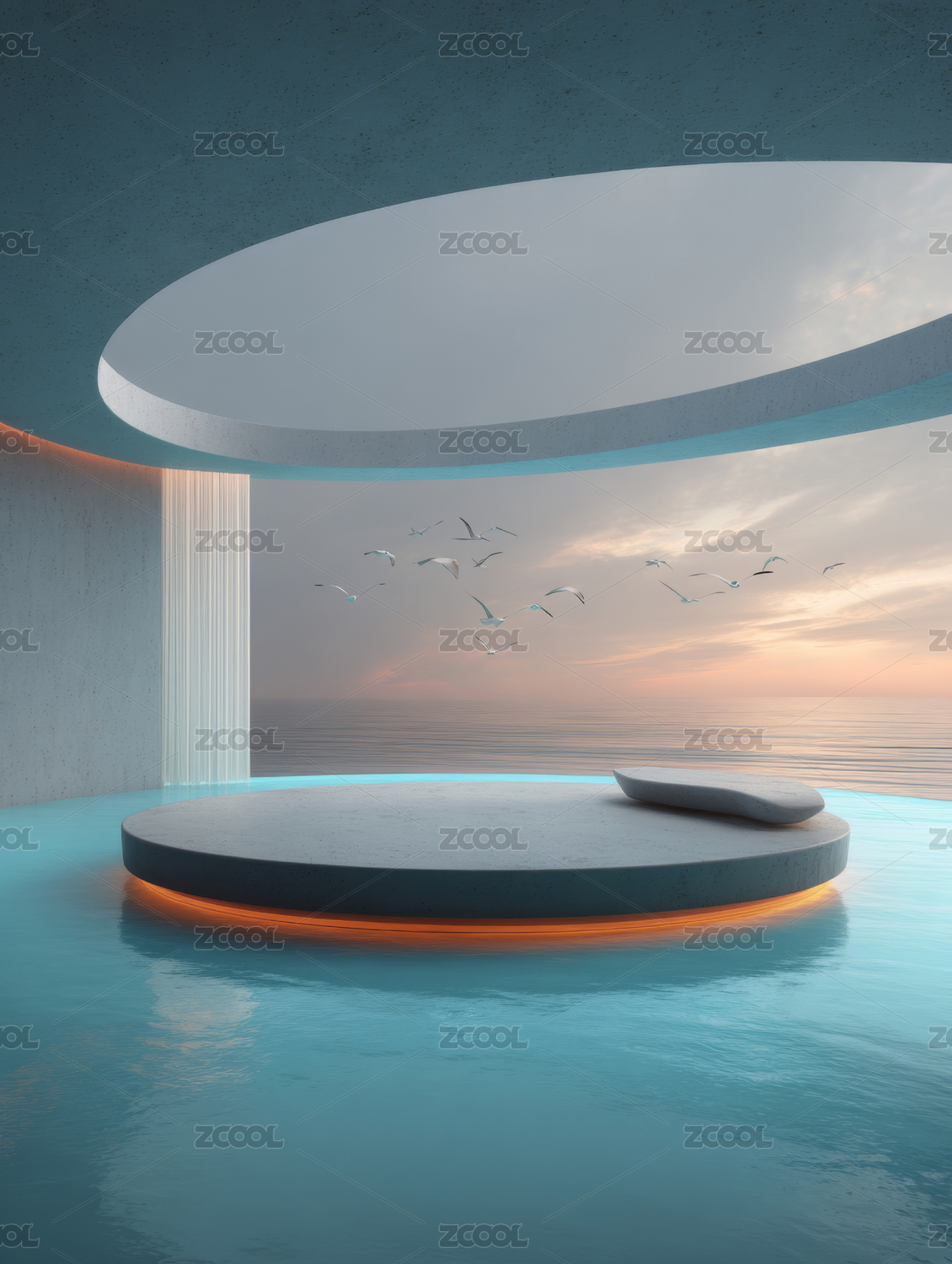 未来感,圆形,舞台,天空,云朵,海洋,灯光,蓝色,现代,设计