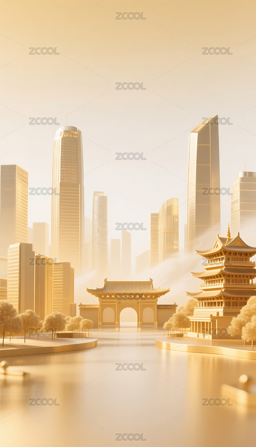 金色现代城市建筑和古建筑插画背景壁纸