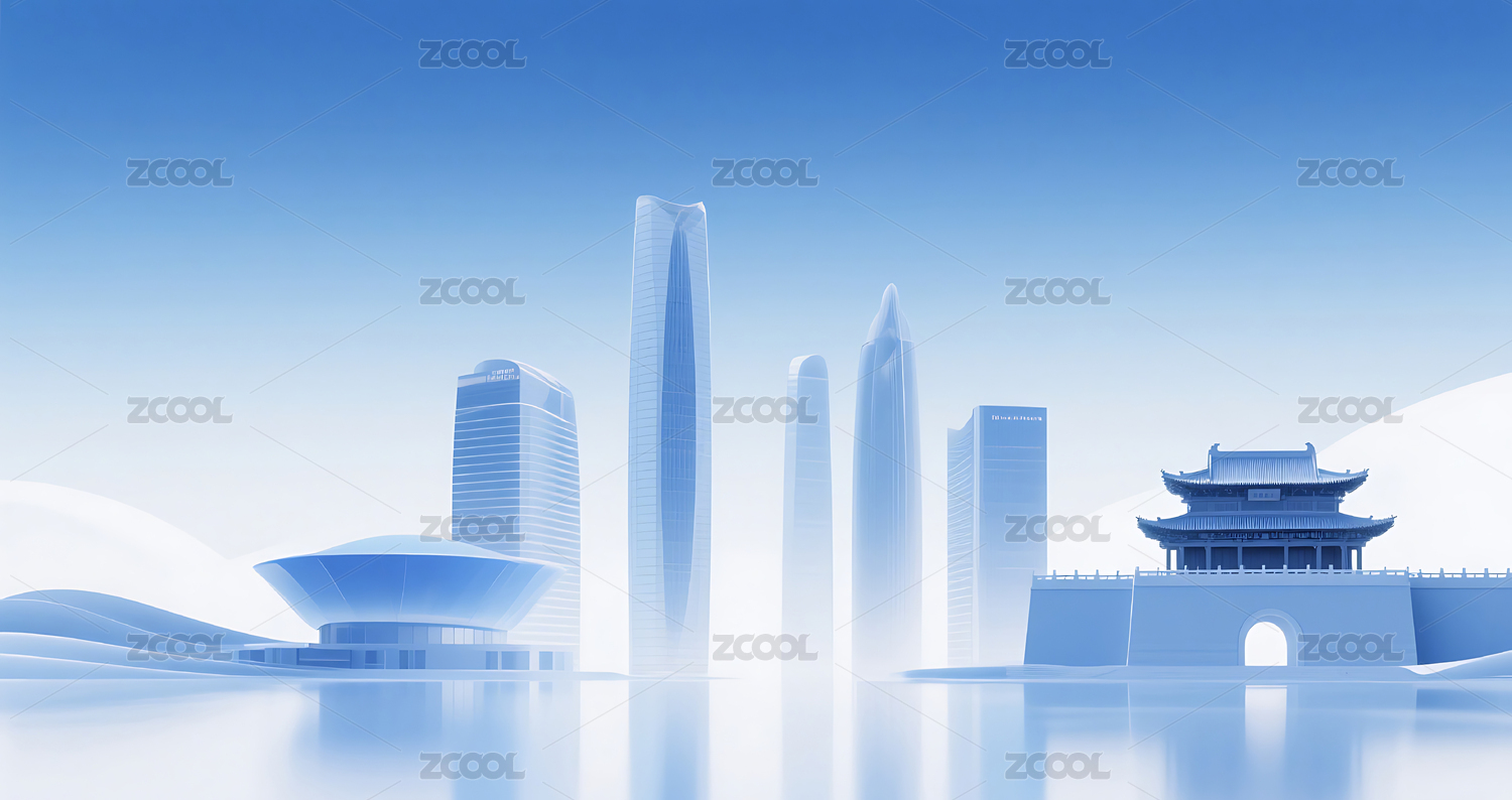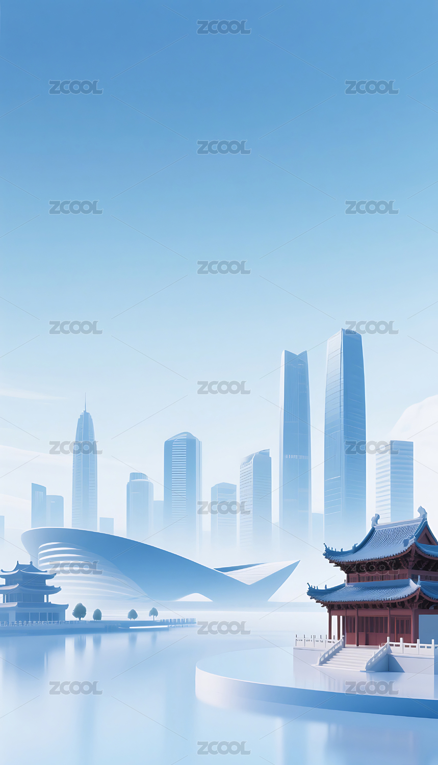 蓝色现代城市建筑和古建筑插画背景壁纸
