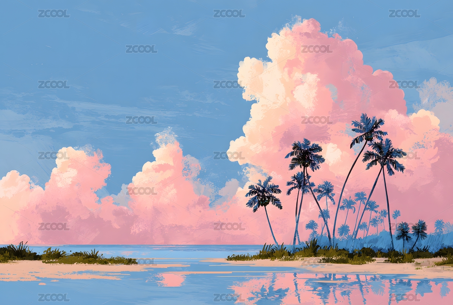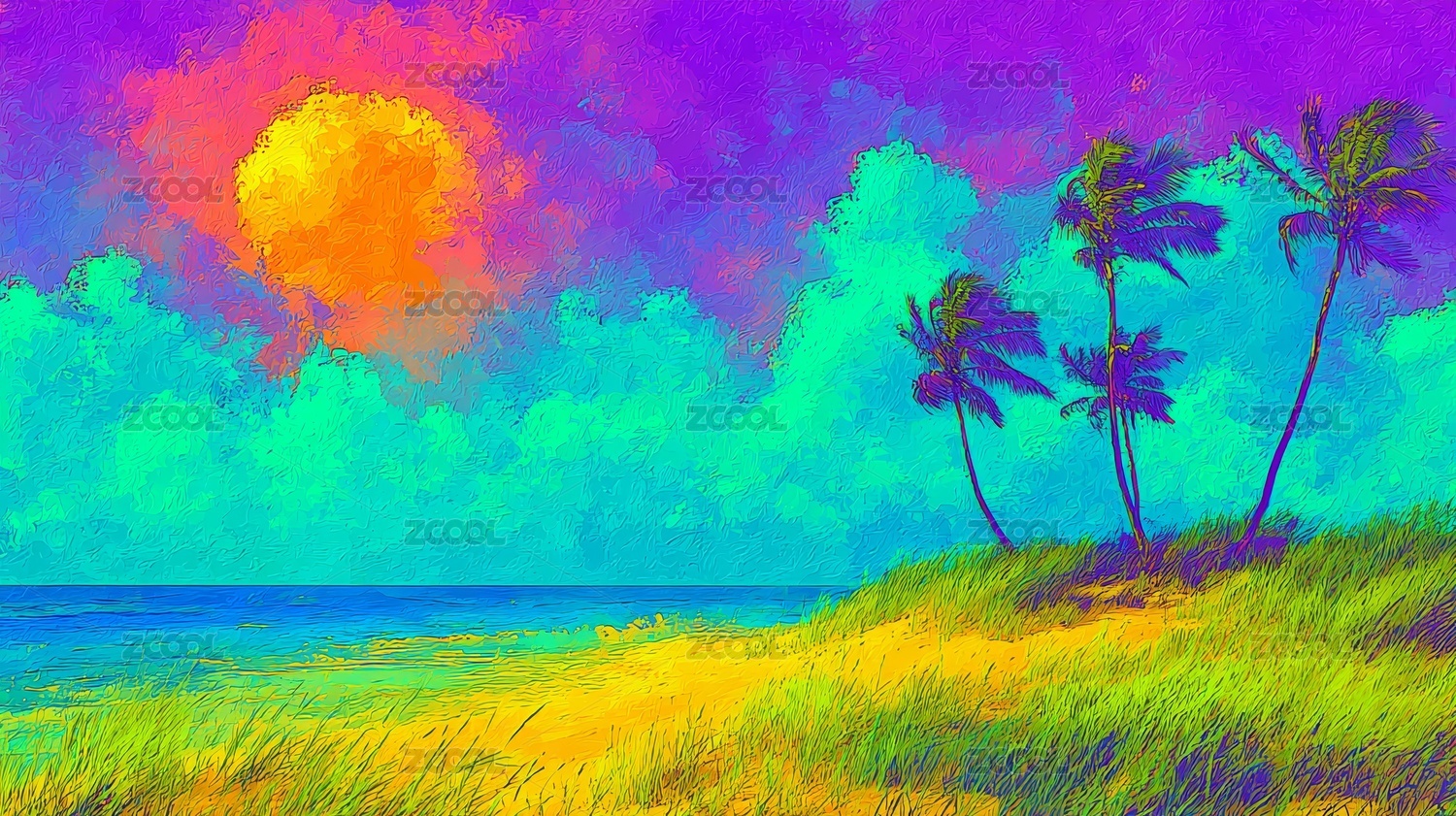 海边,落日,棕榈树,美景,插画,风景,自然,天空,海洋,沙滩