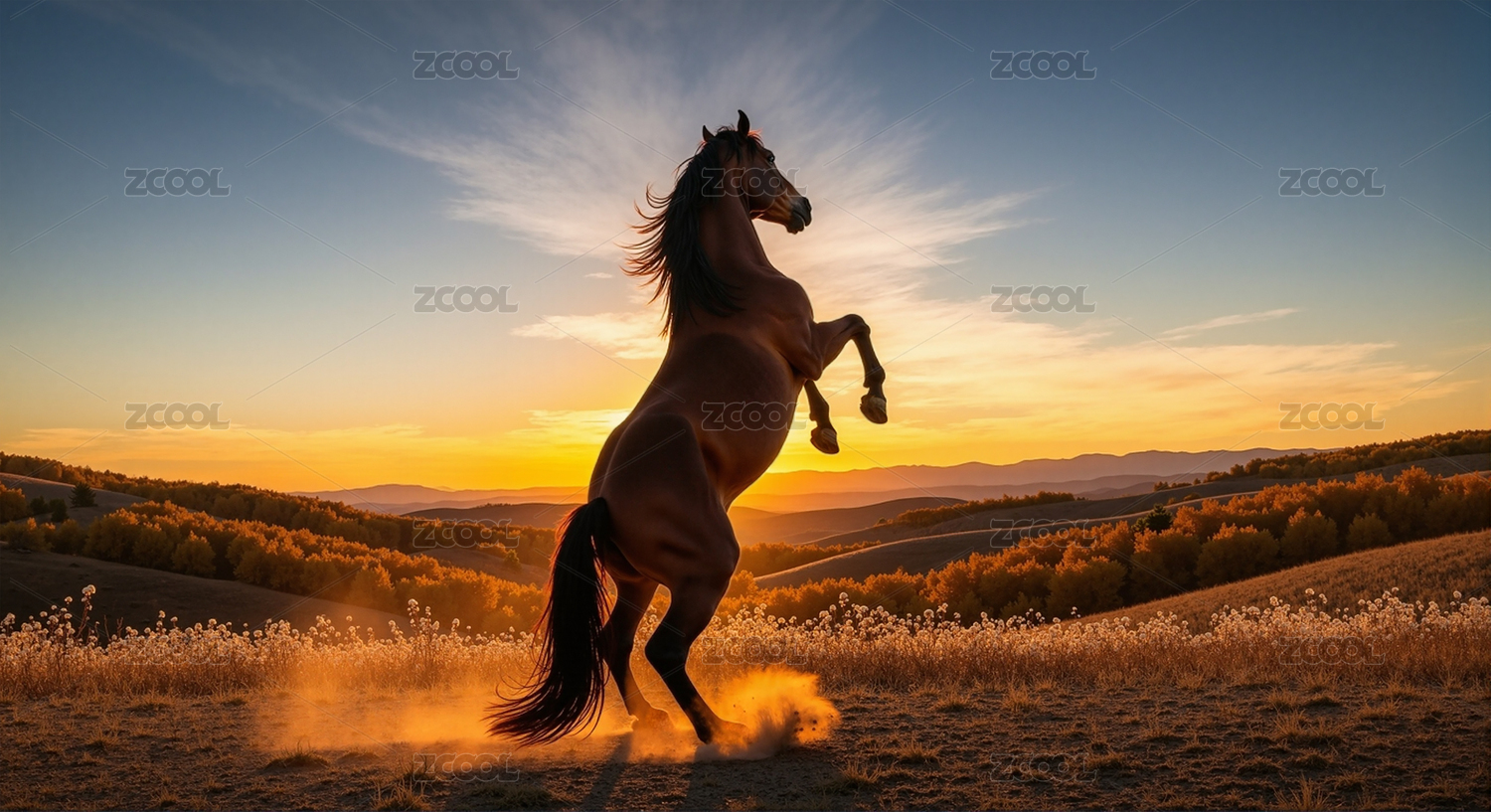 夕阳光照下一匹烈马在金黄色草地上腾跃而起
