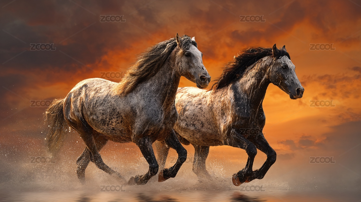 夕阳下海边奔腾的双马