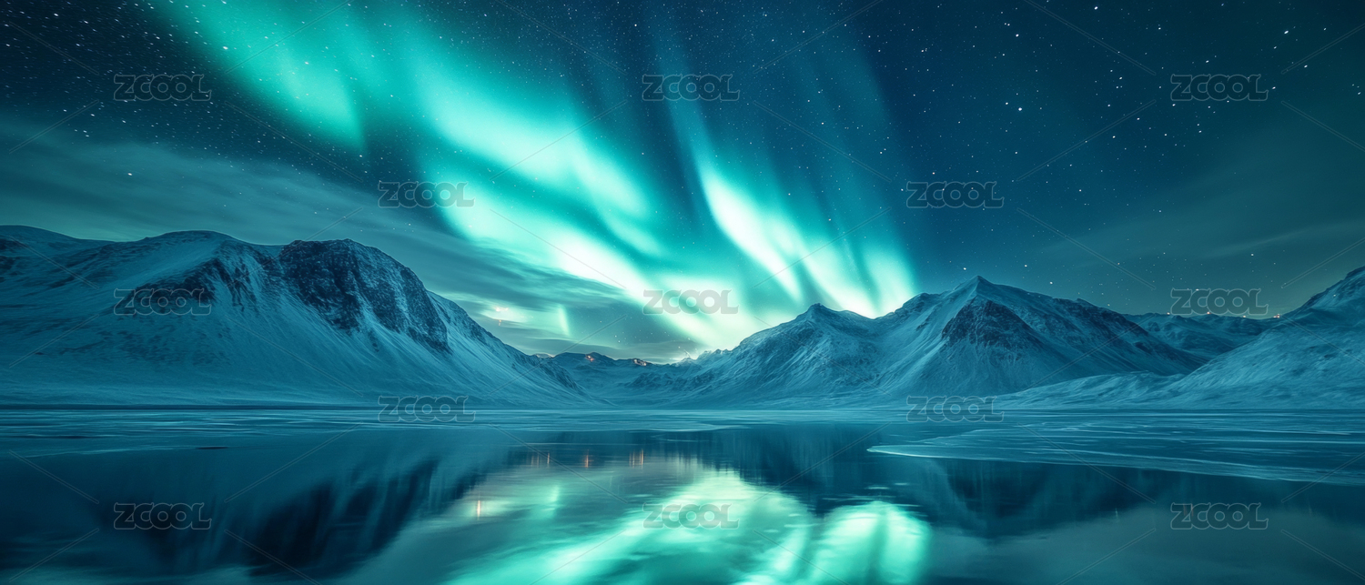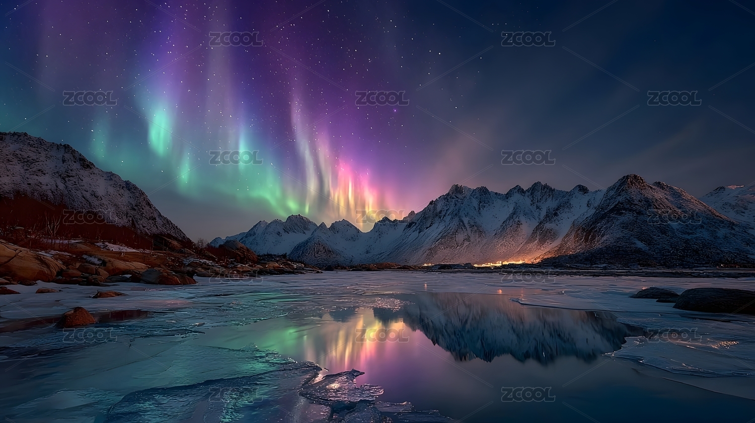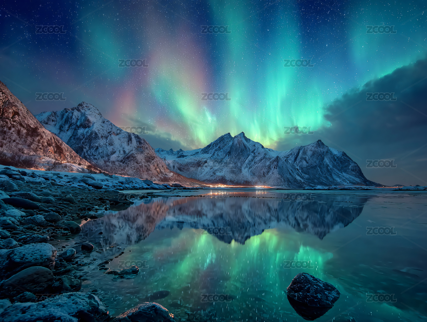 北极光,雪山,湖泊,倒影,夜空,极光,星光,寒冷,冰山,宁静