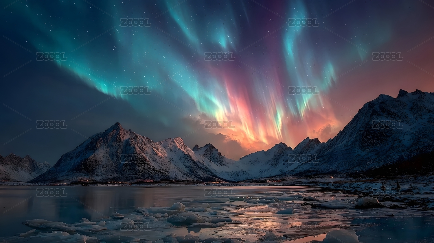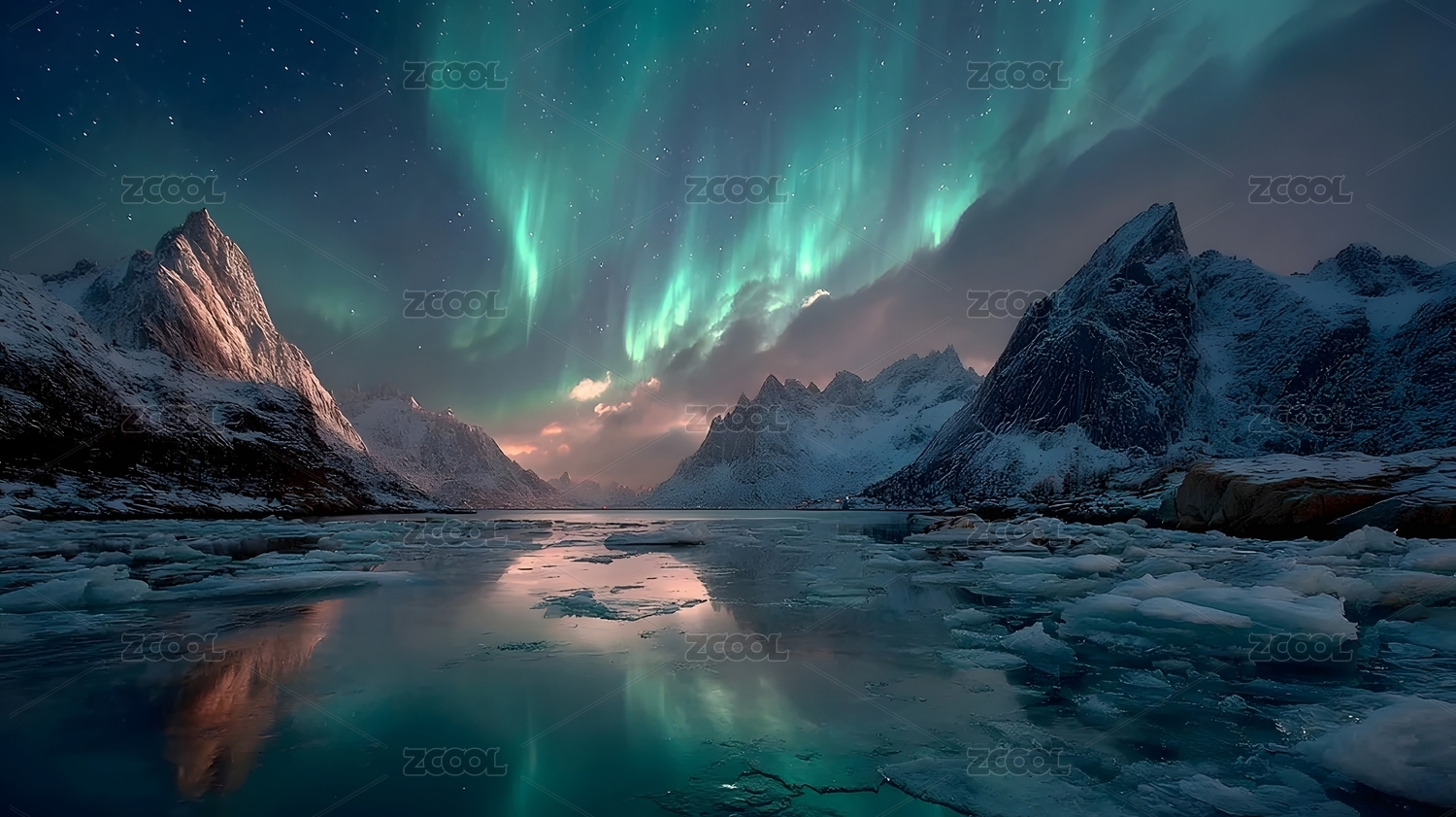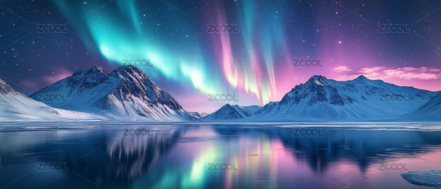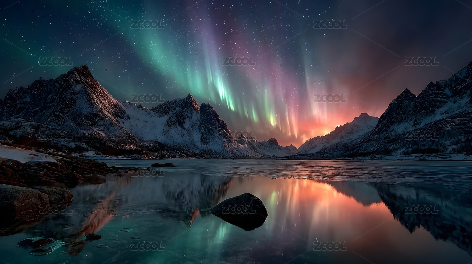北极光,雪山,湖泊,倒影,夜空,极光,星光,寒冷,冰山,宁静