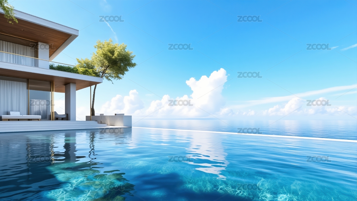 热带岛屿别墅与蓝色游泳池,面朝碧蓝海洋