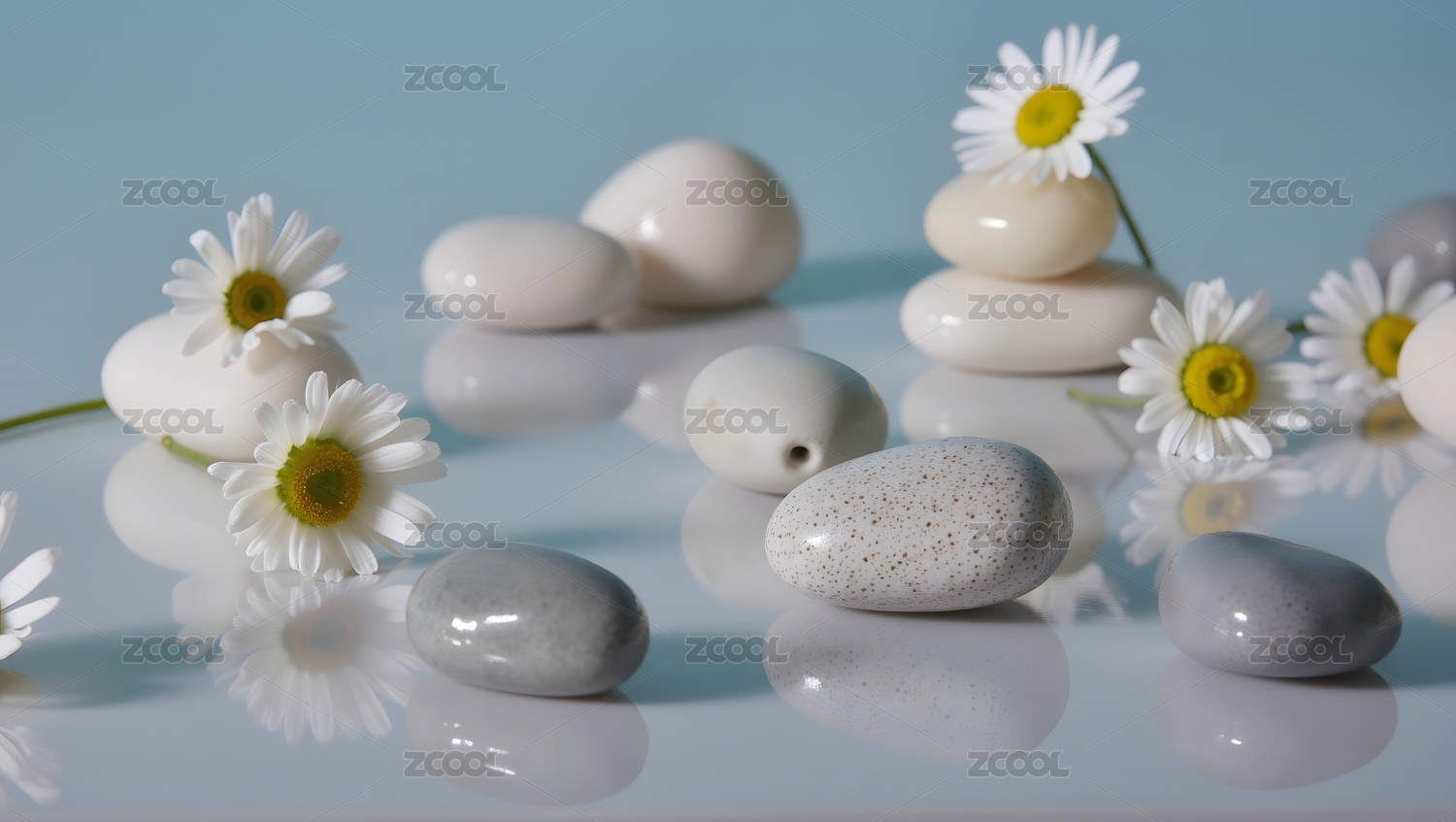 灰白色美妆拍摄背景上的石头和薄荷叶