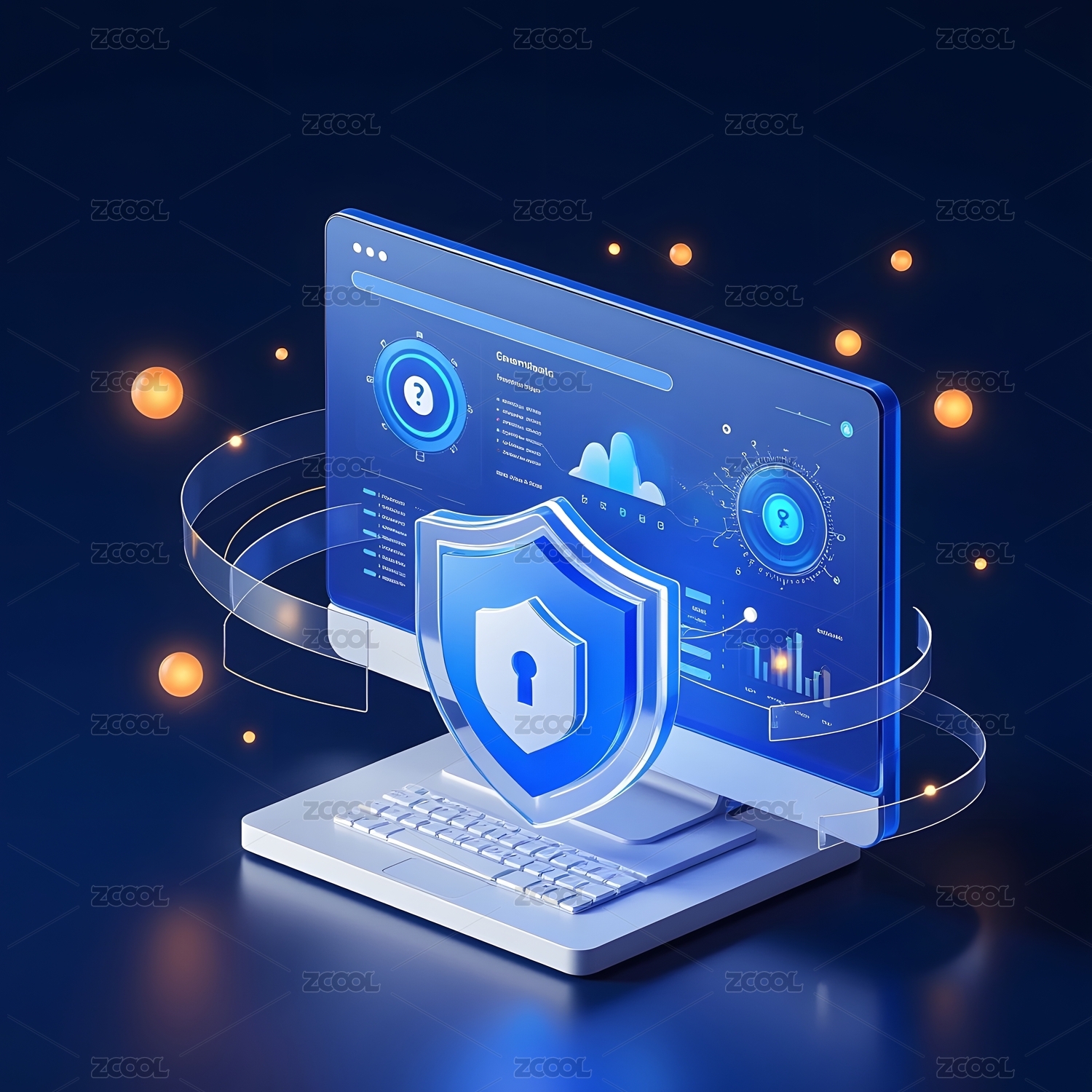 电脑屏幕数据图表与安全图标
