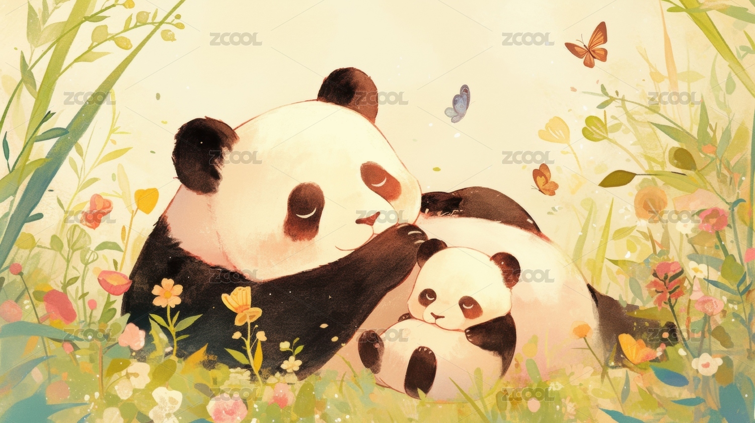 熊猫抱着幼崽吃竹子插画