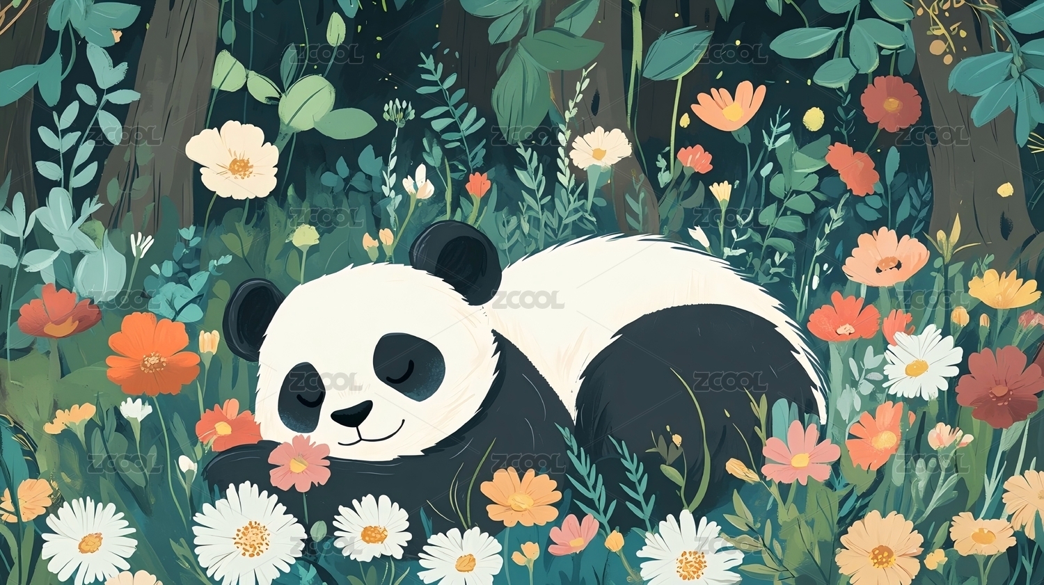 可爱熊猫置身多彩植物间