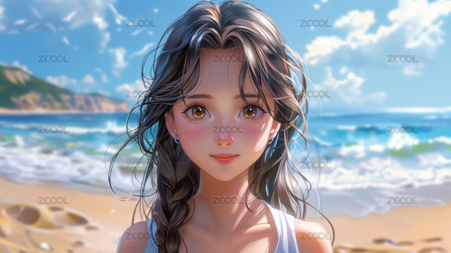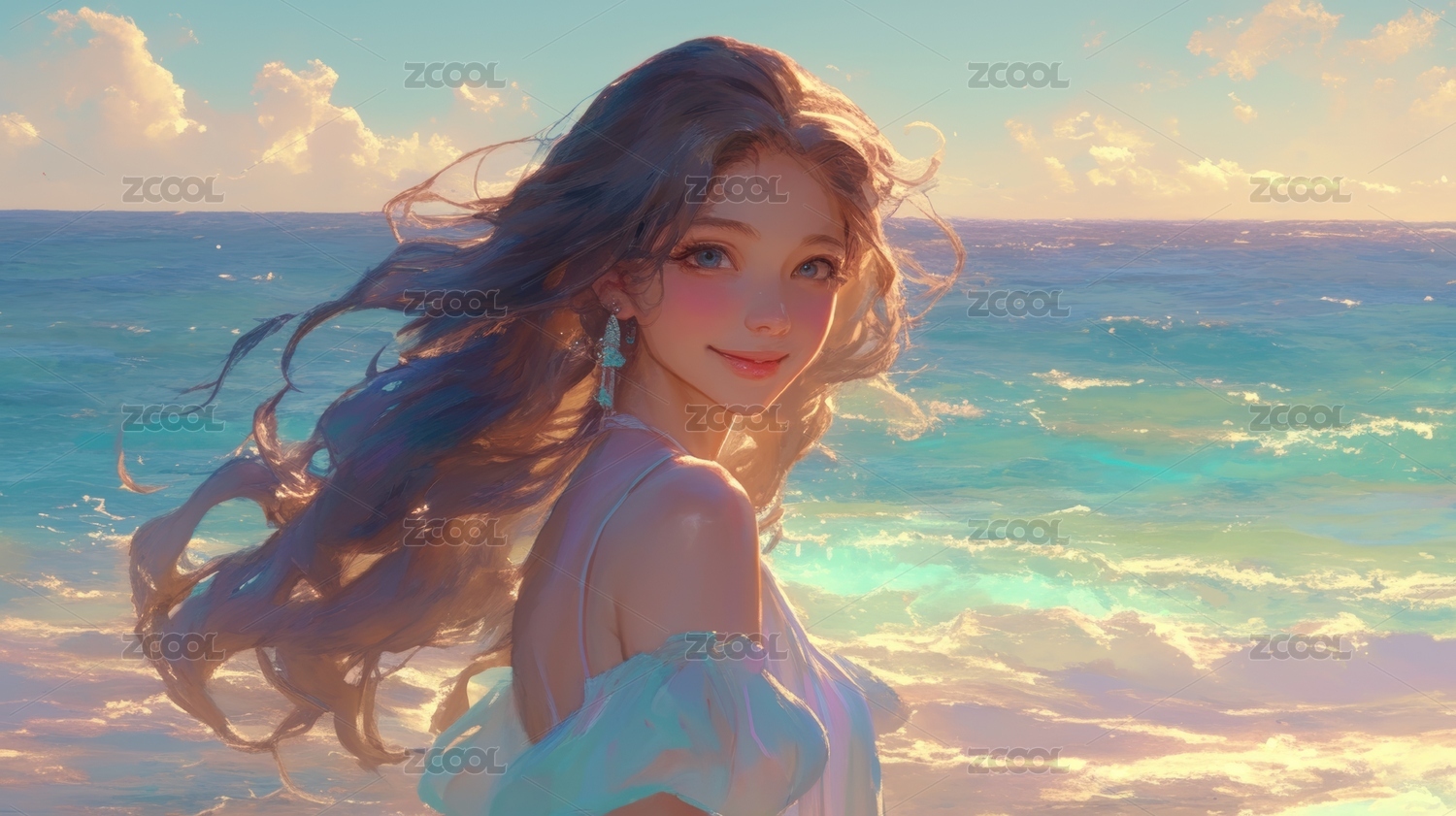 唯美的海边一名身穿紧身泳衣的美丽女人插画