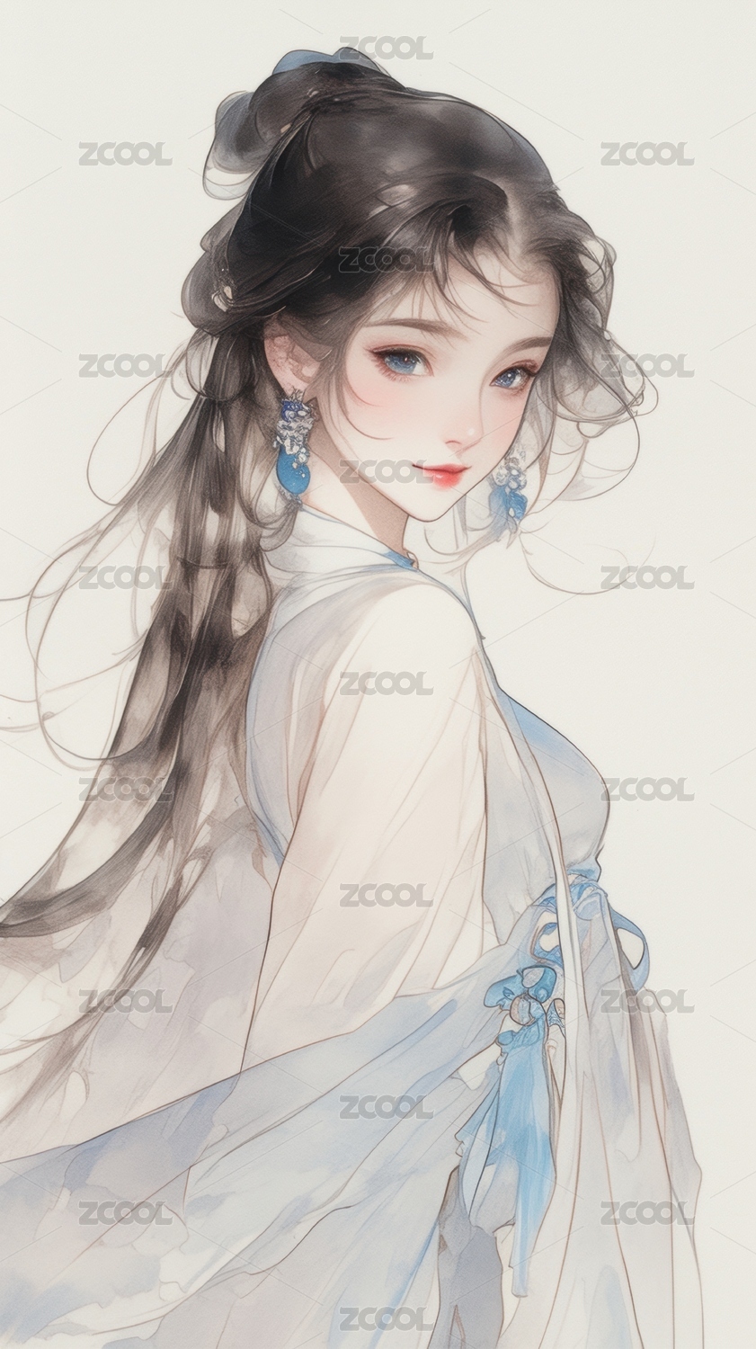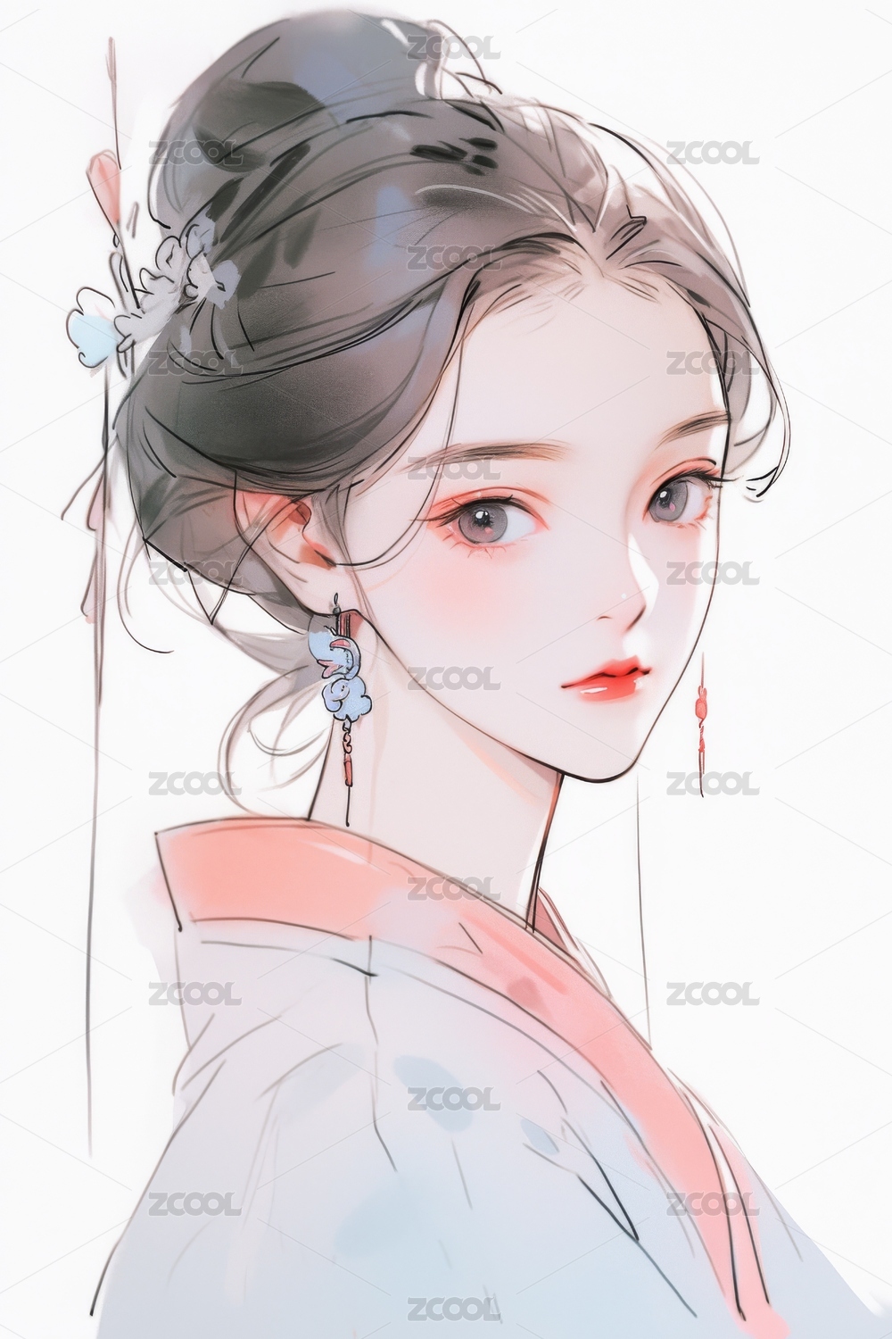 插画,传统,艺术,长发,服饰,女子,人物,细腻,美丽,宁静
