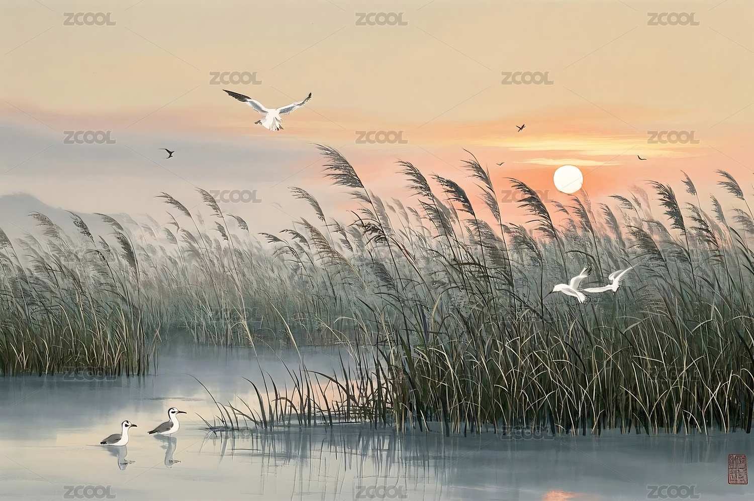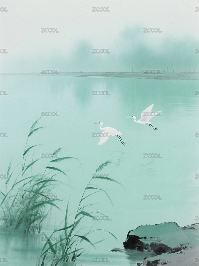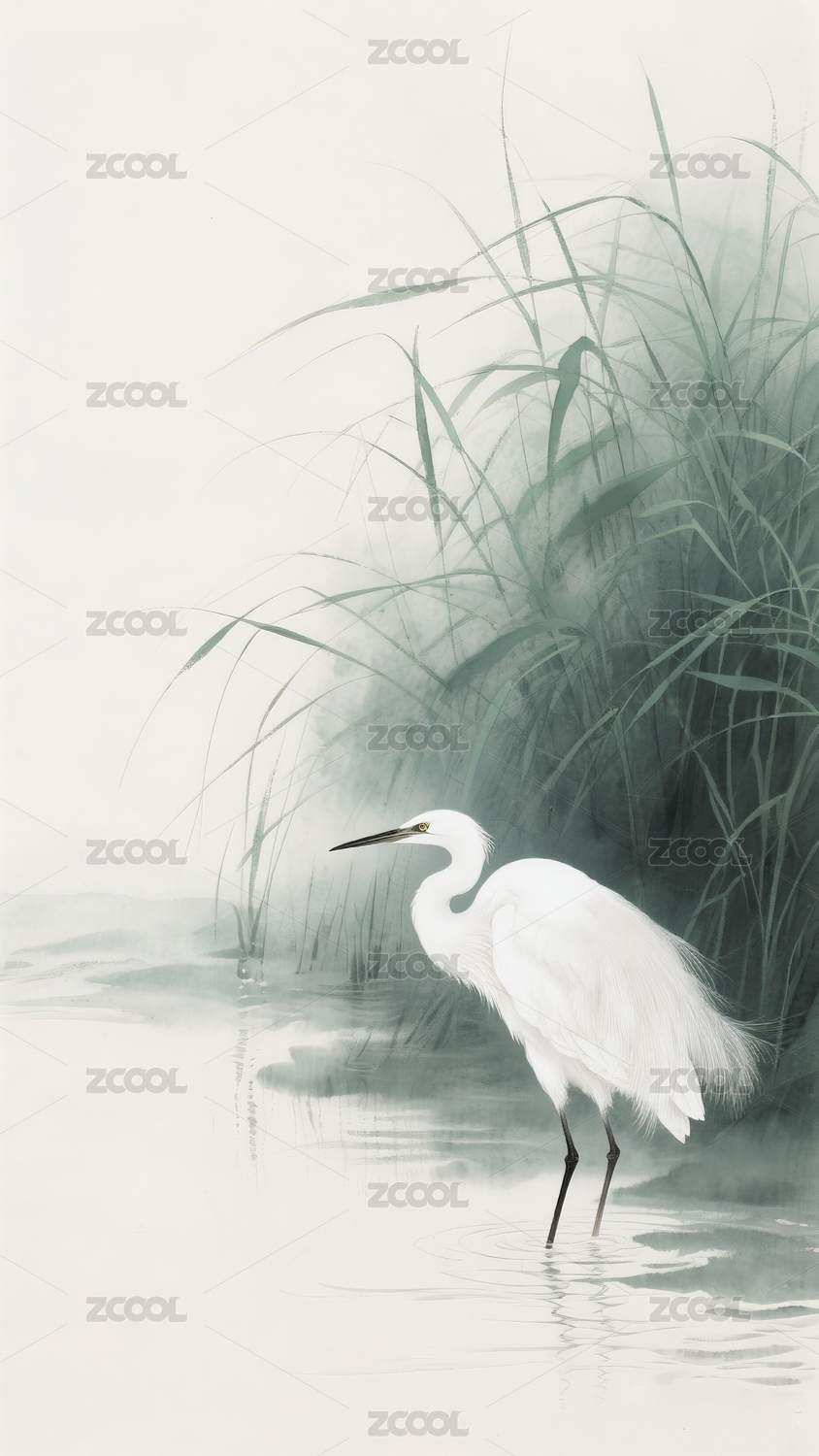 水墨画,极简,芦苇,仙鹤,湖泊,水,植物,鸟,秋色,秋天