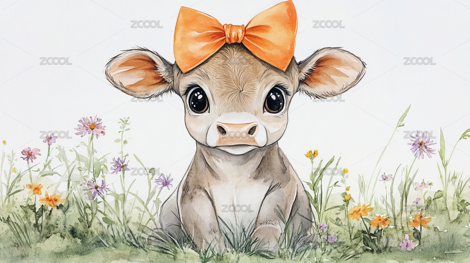 小牛,花环,插画,可爱,动物,卡通,水彩,花卉,装饰,图案
