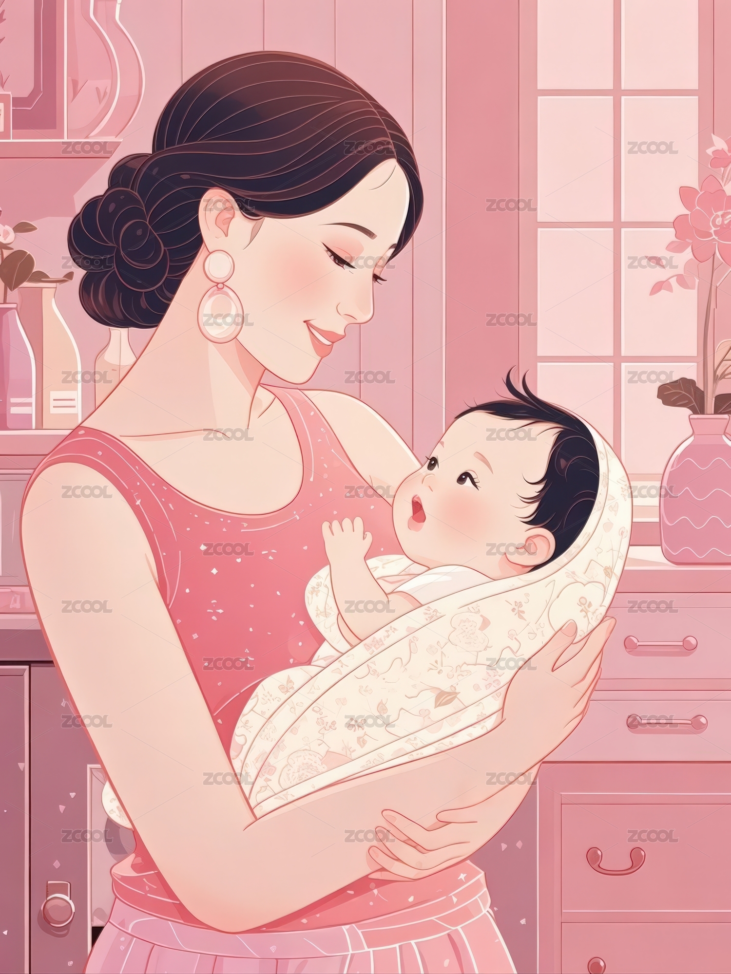 康乃馨花丛中母亲抱着熟睡的婴儿母亲节插画