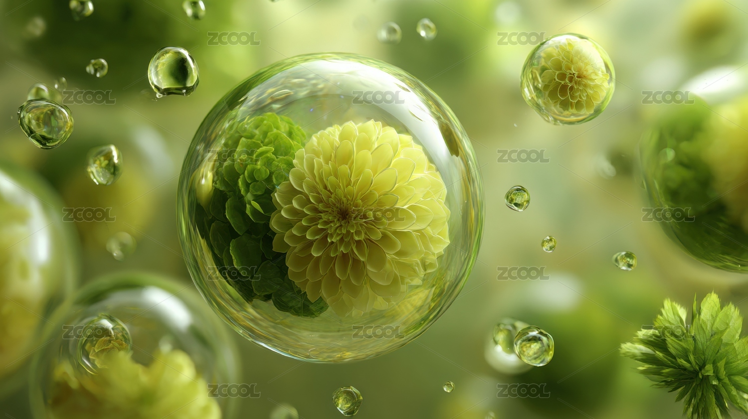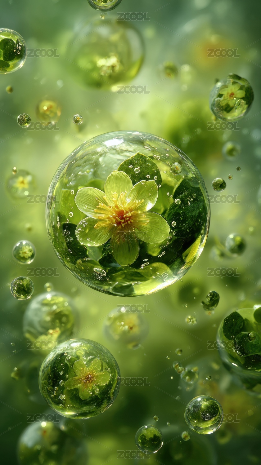 悬浮水泡中的绿色花朵