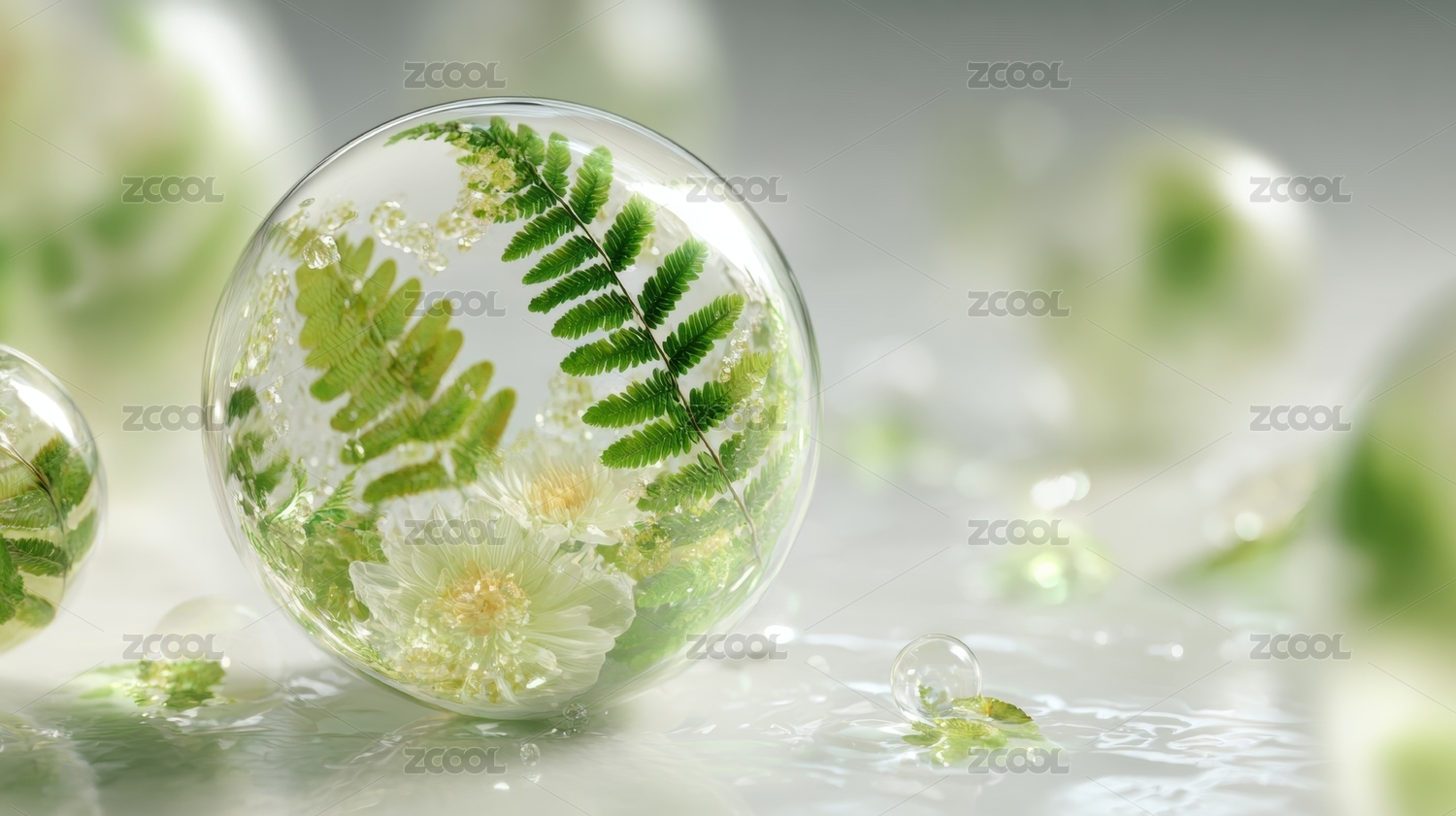 透明泡泡中的绿色植物与花朵