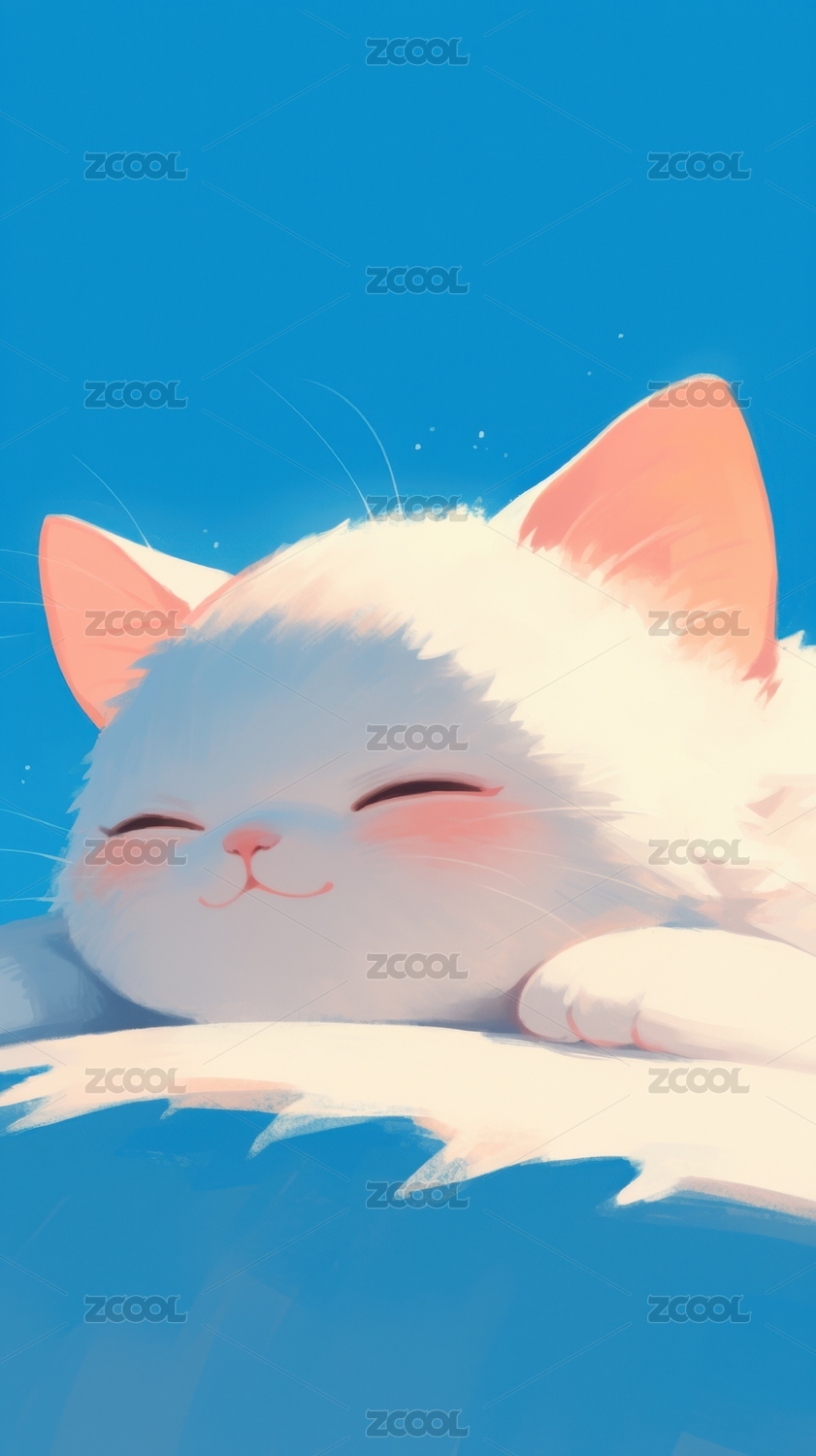 蓝天下熟睡的白色小猫