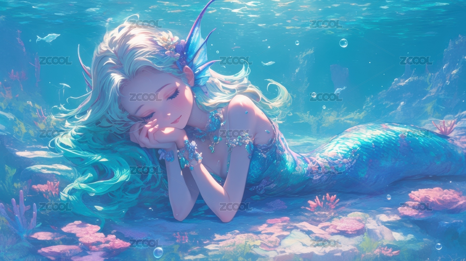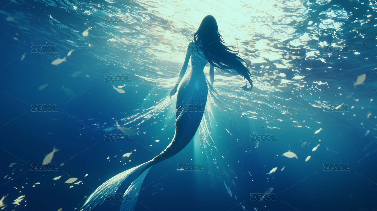 侧面美人鱼向上游蓝色海洋唯美清新简约插画
